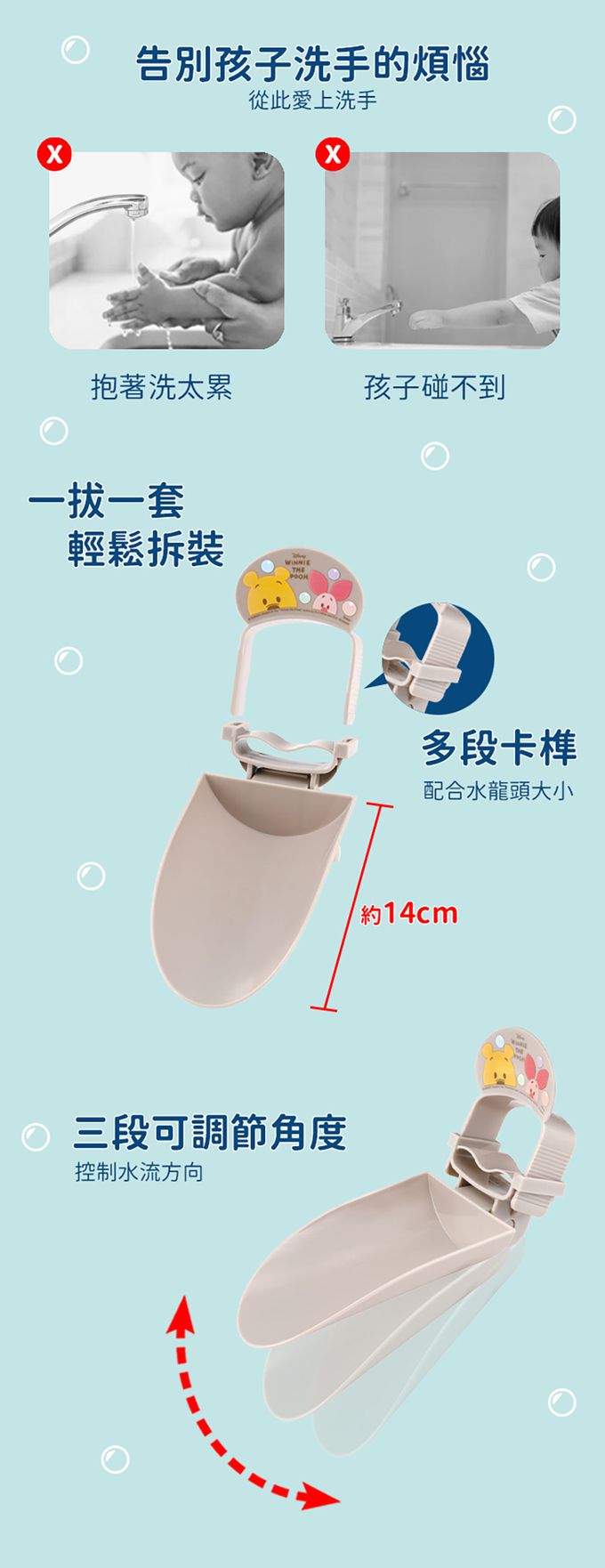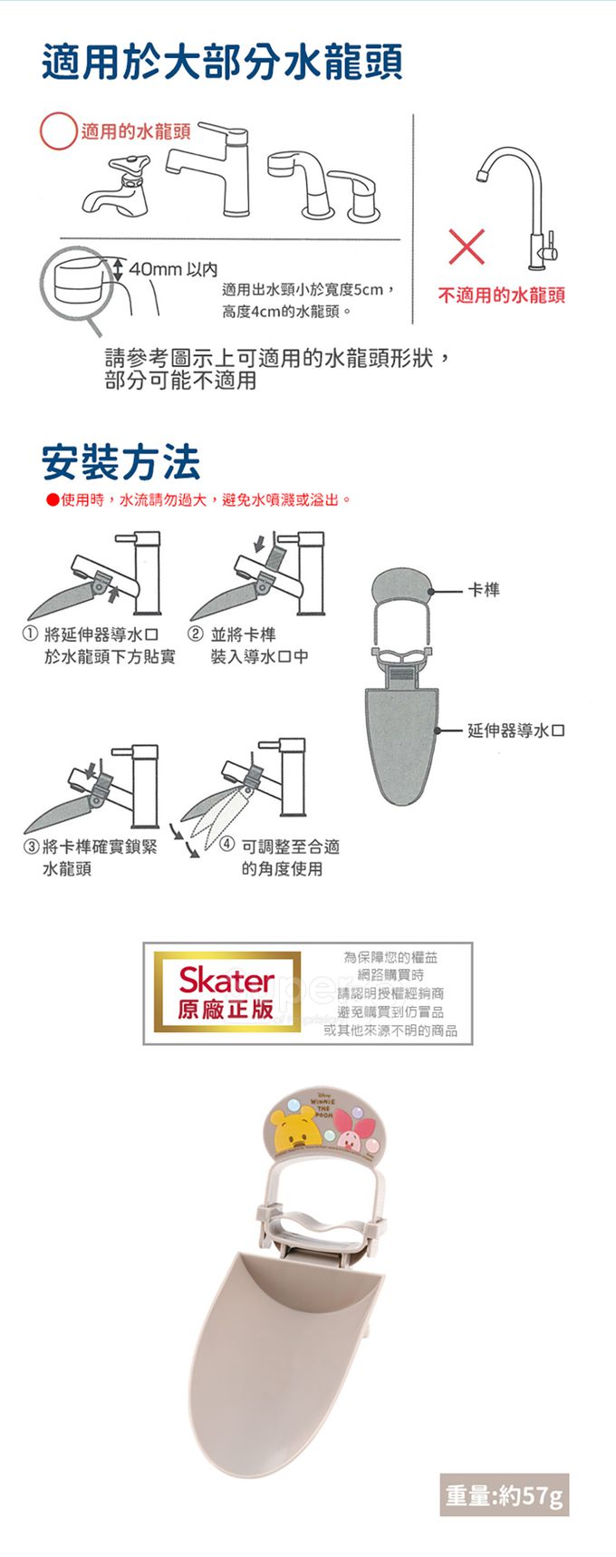 注意事項:1、請參考圖示上可適用的水龍頭形狀,部分可能不適用。 2、適用出水頸小於寬度五公分、高度4公分的水龍頭。 3、使用時,水流請勿過大,避免水噴濺或溢出。 4、請遠離火源。 5、此品為日本原裝,包裝密實,拆封後無法復原,請確認所需後再請購買。 6、請在成人看護下使用。