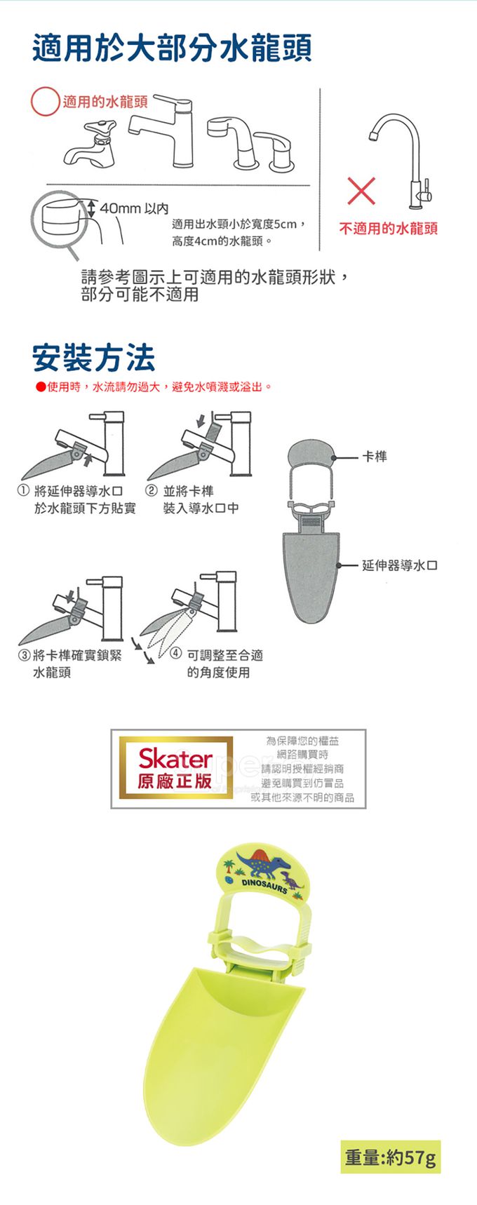 注意事項:1、請參考圖示上可適用的水龍頭形狀,部分可能不適用。 2、適用出水頸小於寬度五公分、高度4公分的水龍頭。 3、使用時,水流請勿過大,避免水噴濺或溢出。 4、請遠離火源。 5、此品為日本原裝,包裝密實,拆封後無法復原,請確認所需後再請購買。 6、請在成人看護下使用。