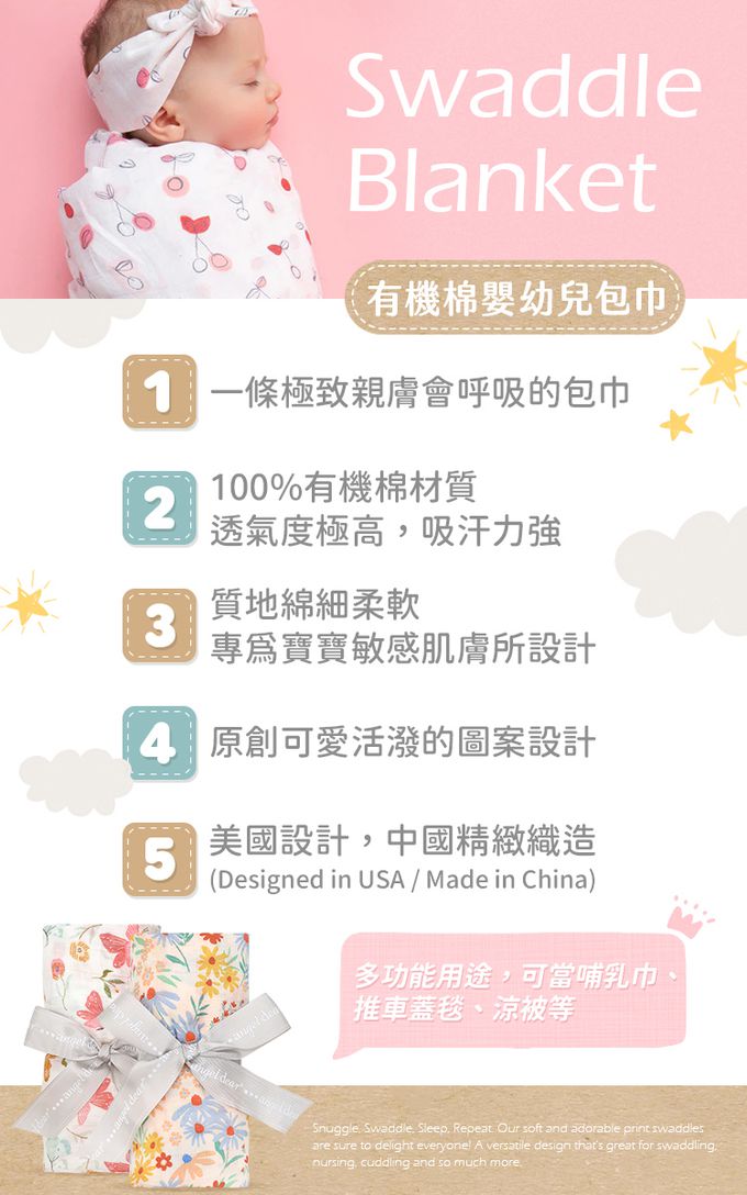 。一條極致親膚會呼吸的包巾。100%有機棉材質, 透氣度極高, 吸汗力強。質地綿細柔軟, 專為寶寶敏感肌膚所設計。原創可愛活潑的圖案設計。多功能用途, 可當哺乳巾, 推車蓋毯, 涼被等。美國設計, 中國精緻織造 (Designed in USA, Made in China)