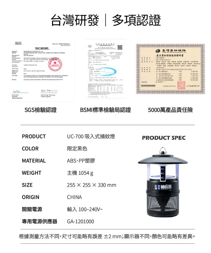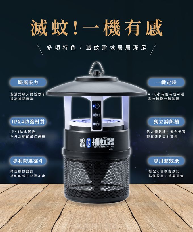品名:吸入式捕蚊器/捕蚊燈/滅蚊燈 UC-700 (IPX4防潑水/無腳架/首創誘餌+黏蚊紙/LED