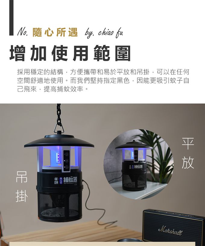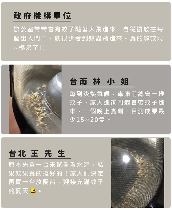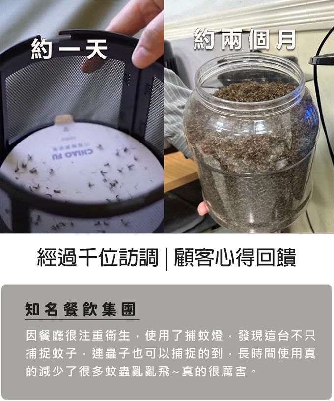 注意事項:捕蚊器設置小秘訣: 1. 請將捕蚊器放置在陰暗無人的環境,人或寵物盡量遠離捕蚊器,以免降低誘蚊效果。 2. 捕蚊器應遠離風扇、冷氣等出風口。 3. 蚊子飛行有一定高度,建議設置離地面高75~100公分(大約成人腰部高度),才能達到最佳捕蚊效果。 4. 可將捕蚊器輪流放置在不同區域(如白天放房間,晚上放客廳),可有效減少環境蚊蟲量。