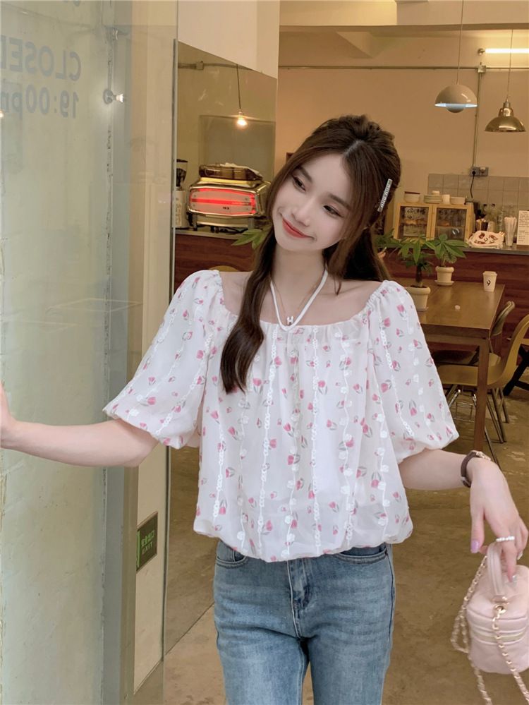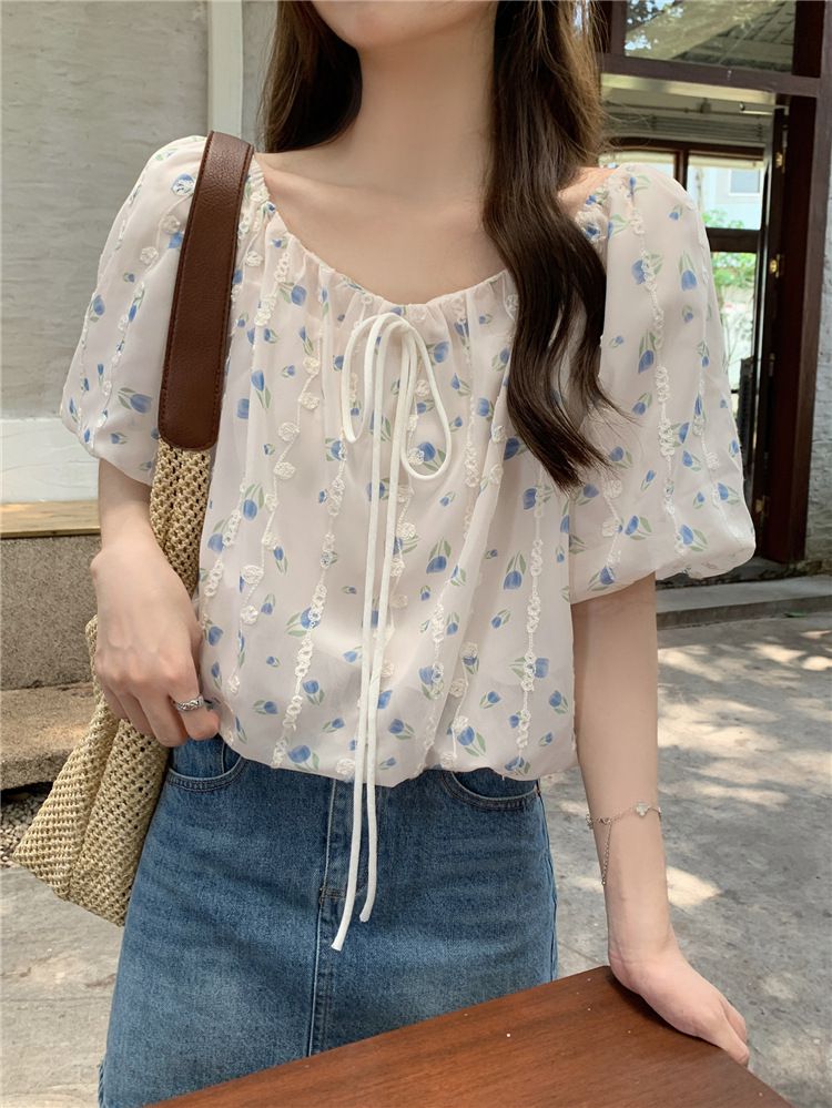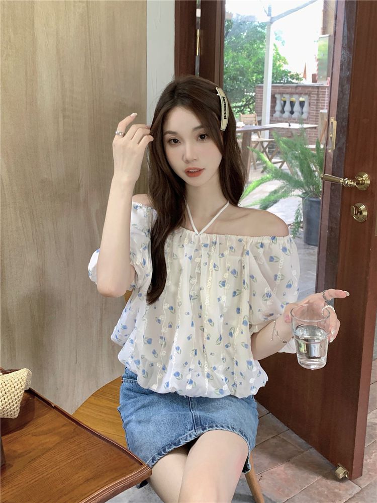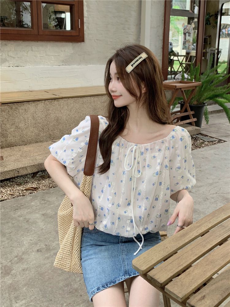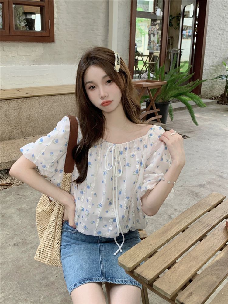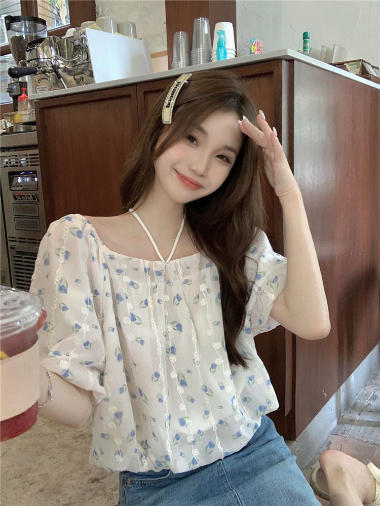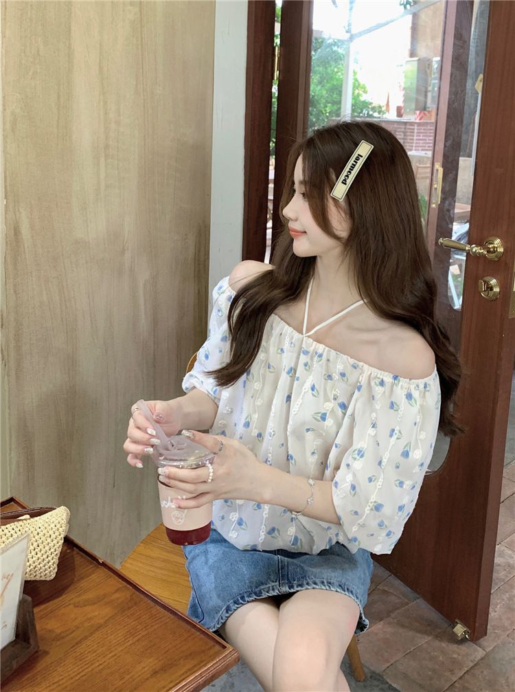824273 小清新花卉刺繡短袖上衣(一字領/方領)-淡藍色 (F)