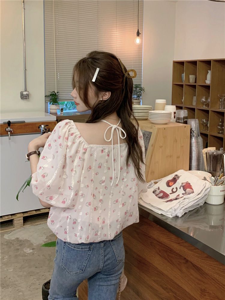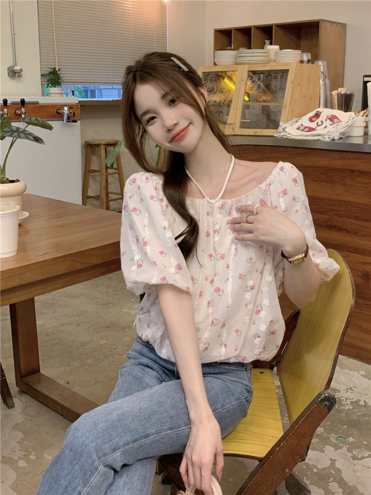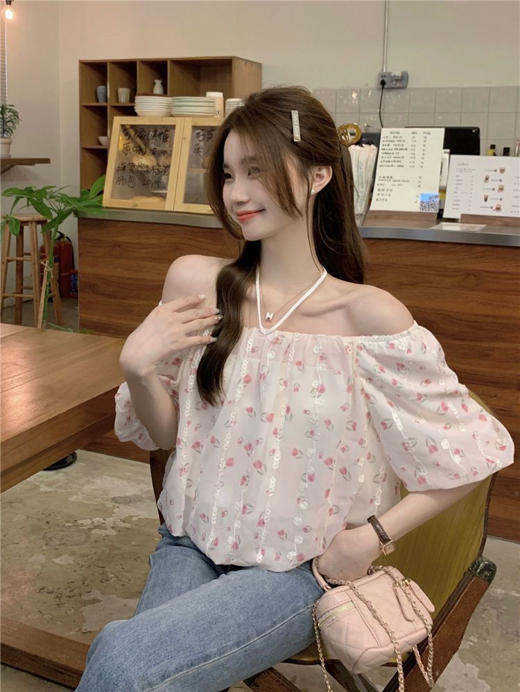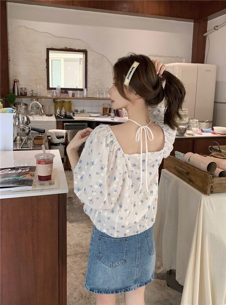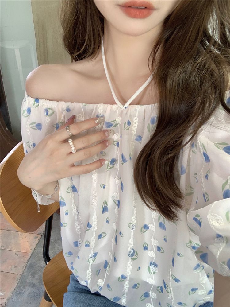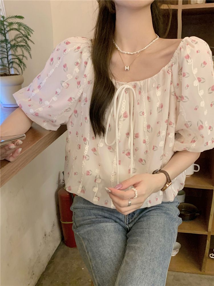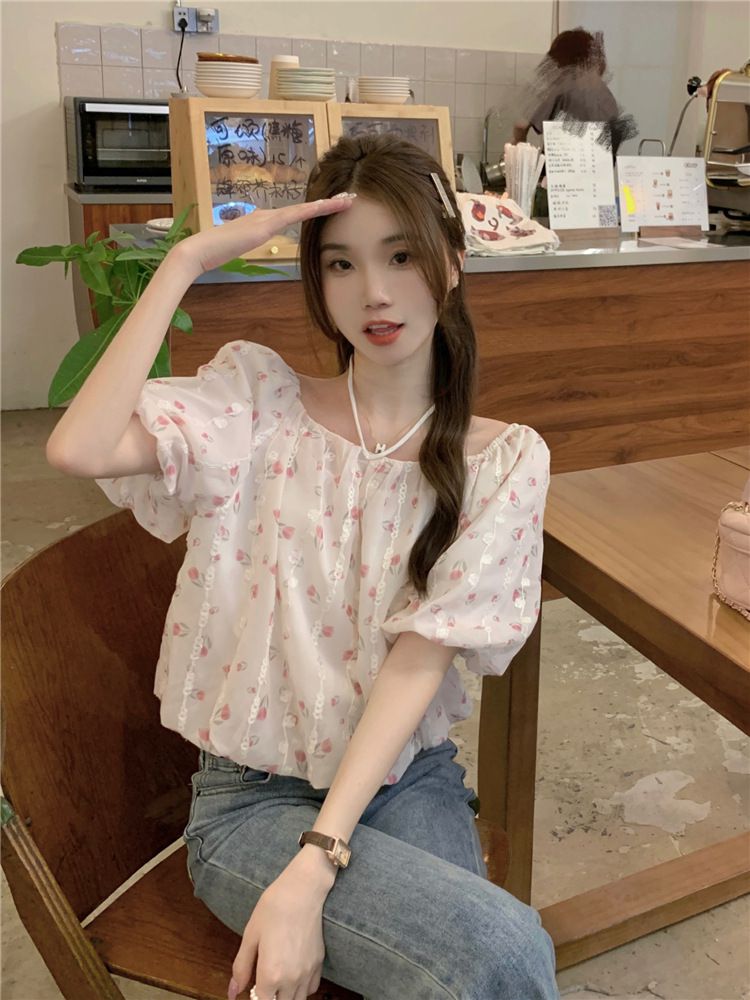 824273 小清新花卉刺繡短袖上衣(一字領/方領)-淡藍色 (F)