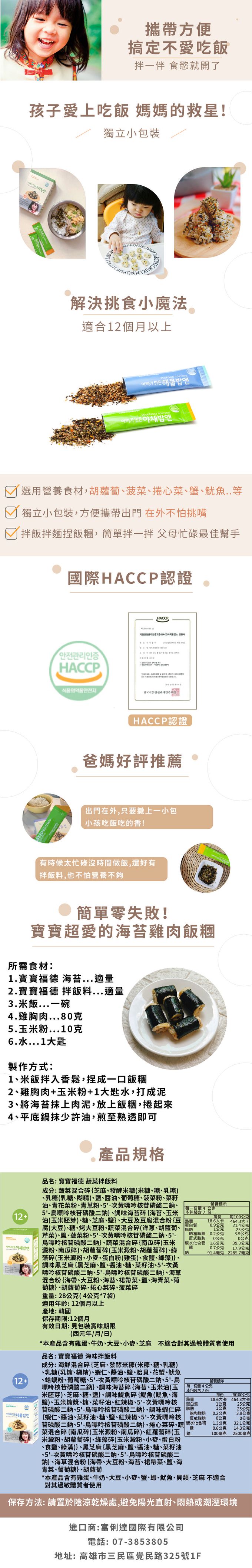 成分:蔬菜混合碎{芝麻、發酵米糠(米糠、糖、乳糖)、乳糖(乳糖、糊精)、鹽、醬油、葡萄糖、菠菜粉、菜籽油、青花菜粉、青蔥粉、5'-次黃嘌呤核苷磷酸二鈉、5'-鳥嘌呤核苷磷 酸二鈉}、調味海苔碎{海苔、玉米油(玉米胚芽)、糖、芝麻、鹽}、大豆及豆腐混合粉{豆腐(大豆)、糖、烤大豆粉、蔬菜混合碎(洋蔥、胡蘿蔔、芹菜)、鹽、菠菜粉、5'-次黃嘌呤核苷磷酸二鈉、5'-鳥嘌呤核苷磷酸二鈉}、蔬菜混合碎{南瓜碎(玉米澱粉、南瓜碎)、胡蘿蔔碎(玉米澱粉、胡蘿蔔碎)、綠藻碎(玉米澱粉、小麥、蛋白粉、食鹽、綠藻)}、調味黑芝麻{黑芝麻、鹽、醬油、糖、菜籽油、5'-次黃嘌呤核苷磷酸二鈉、5'-鳥嘌呤核苷磷酸二鈉}、海草混合粉{海帶、大豆粉、海苔、裙帶菜、鹽、海青菜、葡萄糖}、胡蘿蔔碎、捲心菜碎、菠菜碎