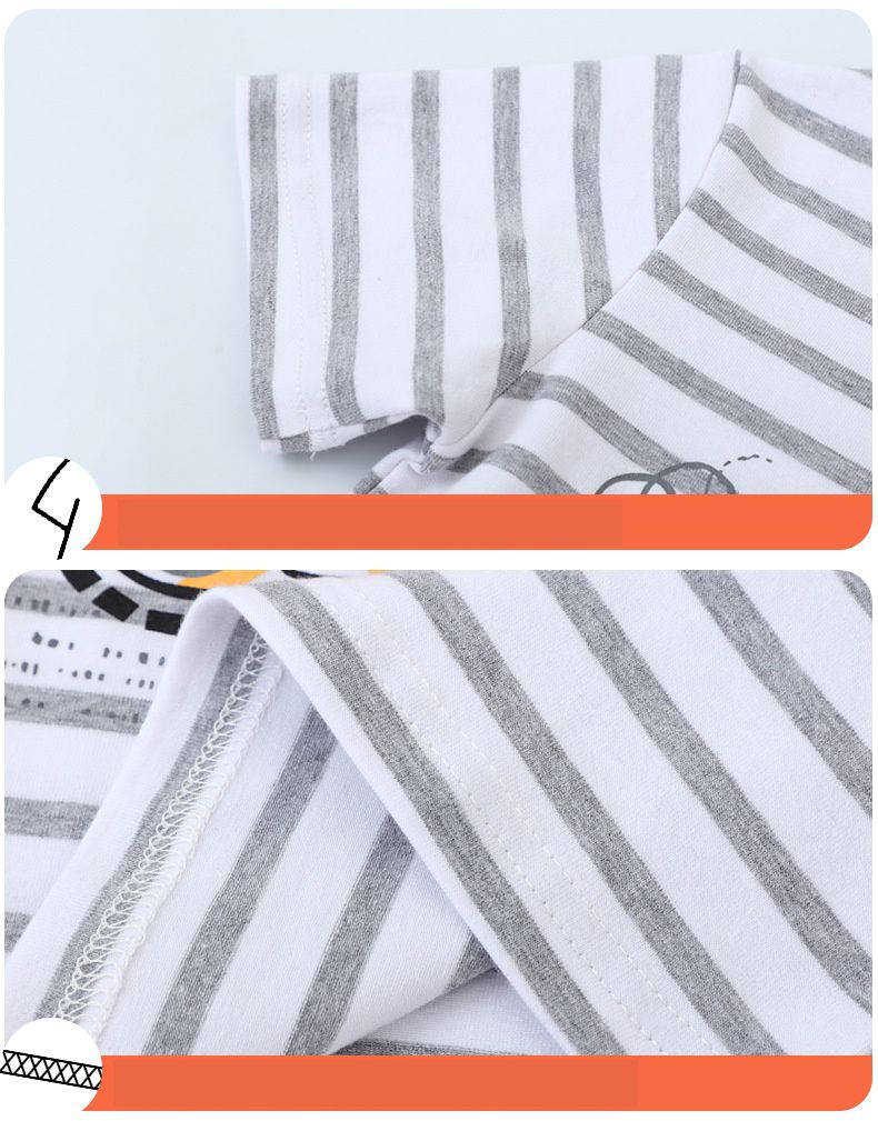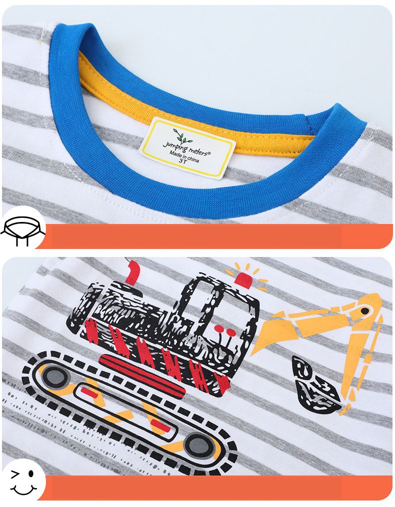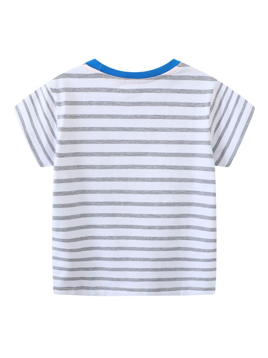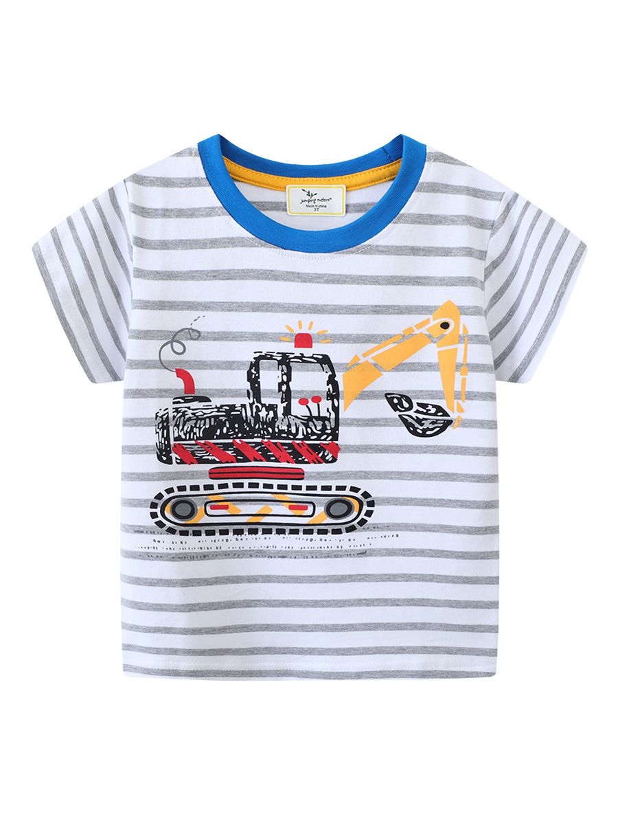 棉質圓領短袖上衣-童趣挖掘機-灰色條紋