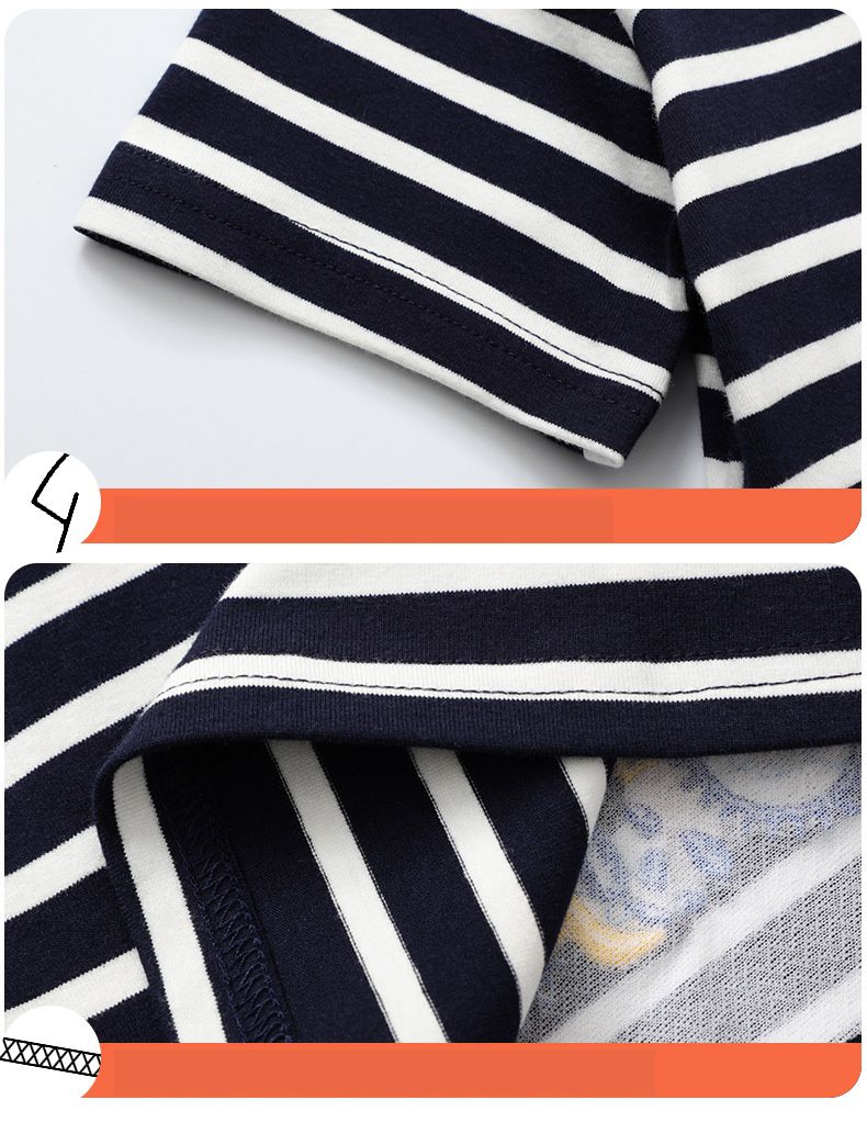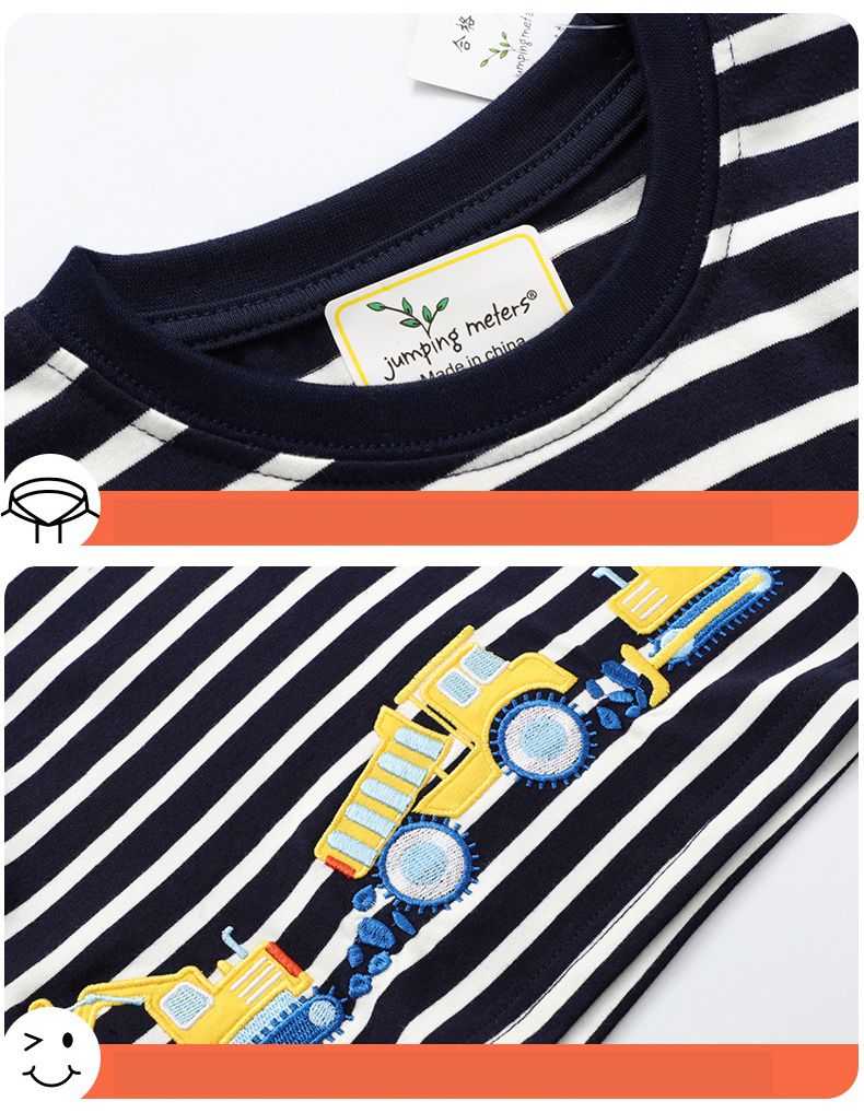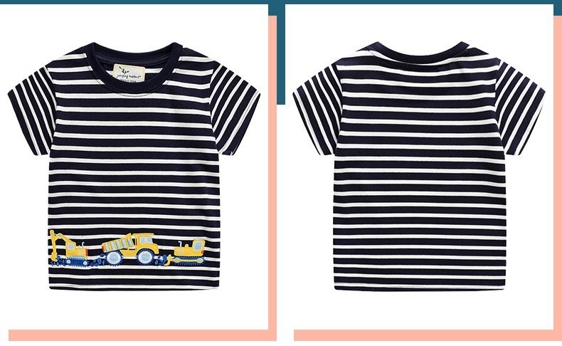 棉質圓領短袖上衣-刺繡工程車-黑底白條