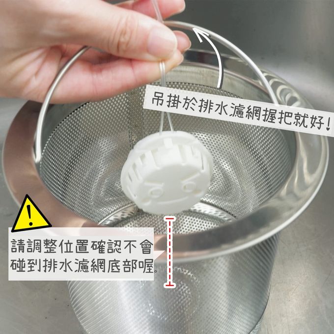 排水槽握把(吊掛方法請參考包裝圖示),請調整位置確認本品不會碰到排水槽底部。