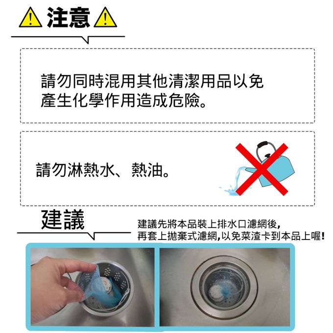 ●非食品,請置於兒童無法觸及處。●請勿使用於原用途外。●請參考流理台等處之使用說明。●請勿使用於原用途外。●本品請勿接觸熱水、熱油,以免產生化學作用造成危險。●本品不可使用於銅製品。●使用於不鏽鋼等金屬或橡膠製品,可能會產生腐蝕、劣化、生鏽情況,請特別留意。●如中途欲停止使用本品,請以大量清水使本品溶解。●如一天以上不使用水槽,請務必取下本品並以密封袋保存。本品一天需沖洗1次,以免成分沾附水槽造成生鏽。●因成分特性,請於通風良好處使用。●取出本品後,請立即掛置於排水槽內。●請勿將塑膠外殼打開。●使用中如塑膠外殼有變色情況為正常,請安心使用。