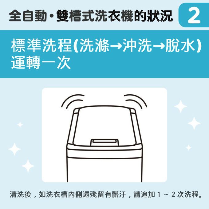 ●步驟3.(此步驟適用於所有洗衣機機種):如有髒汙情況,請追加1~2輪洗程序後再以清水洗淨。