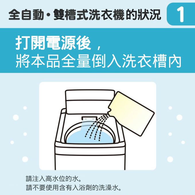 ●步驟1.(此步驟適用於所有洗衣機機種):淨空洗衣槽內倒入本品全量一包。