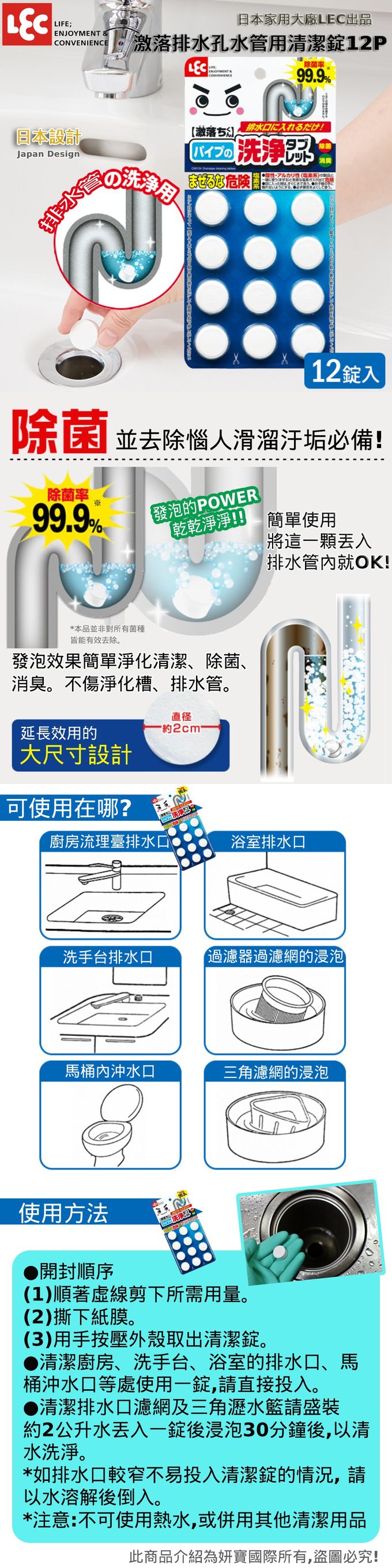 ●廚房、洗手台、浴室的排水口、馬桶沖水口等處,使用一錠,請直接投入。