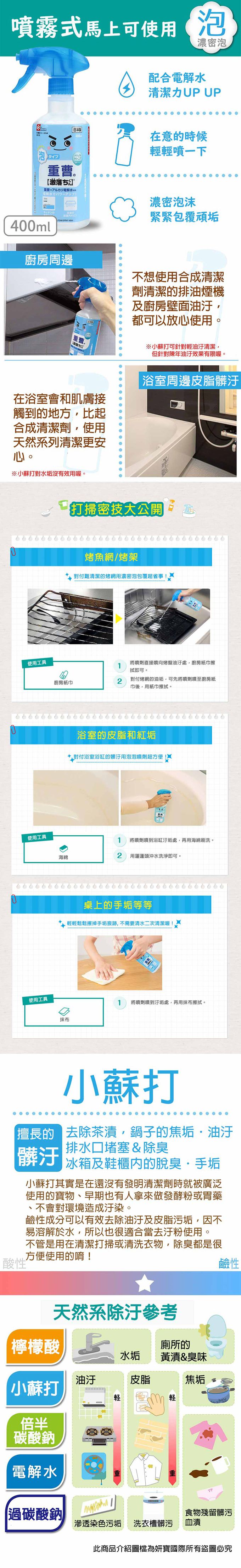 【用途】排油煙機、廚房壁面等處所沾附的油垢,及浴室殘留的皮脂污垢、冰箱內外、餐具櫃、微波爐等調理家電玻璃窗戶等清潔。