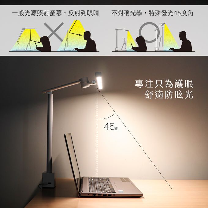 護眼防眩光,不對稱光學設計,特殊發光45度