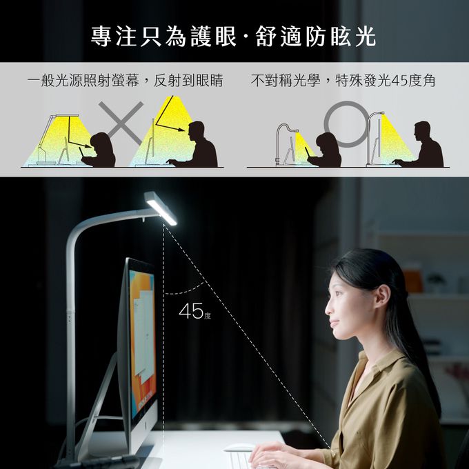 護眼防眩光,不對稱光學設計,特殊發光45度