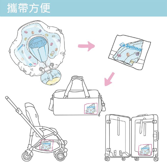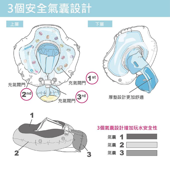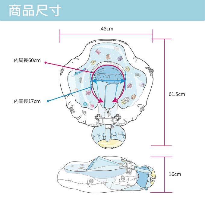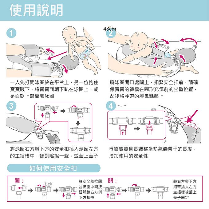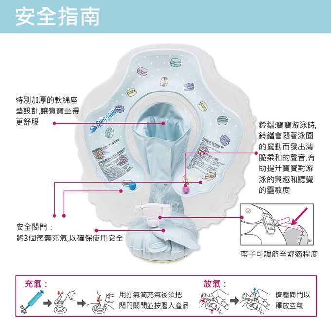 - 請留意使用任何一款泳圈,當寶寶拍水時須隨時留意寶寶重心,避免翻覆