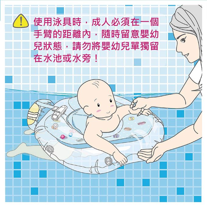 使用泳具時,成人必須在一個手臂的距離內,隨時留意嬰幼兒狀態,請勿將嬰幼兒單獨留在水池或水旁!