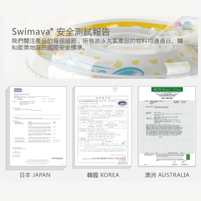 Swimava全系列產品皆為水上玩具(aquatic toys),故已在所有產品警告語和說明書上,多次強調:「使用產品時,成人須全程在旁看護。」為主要安全重點。