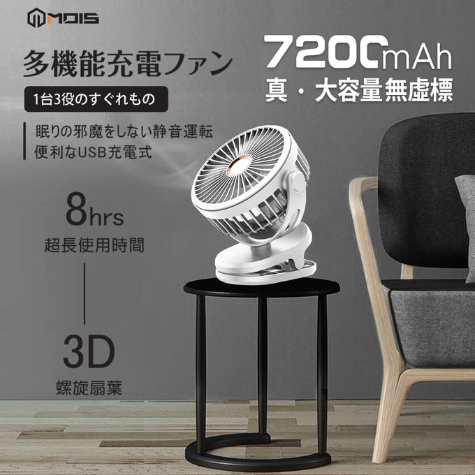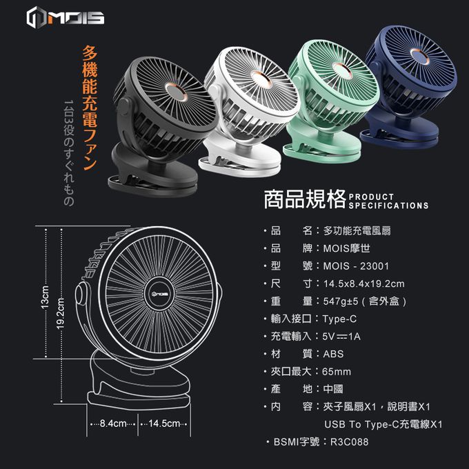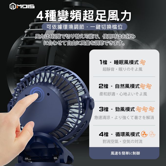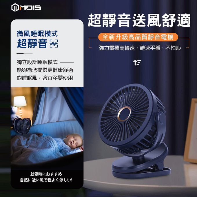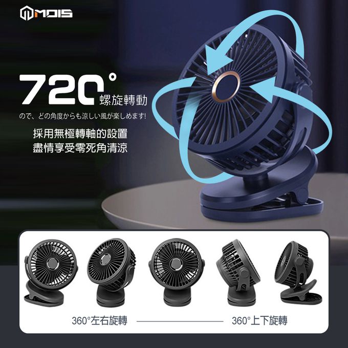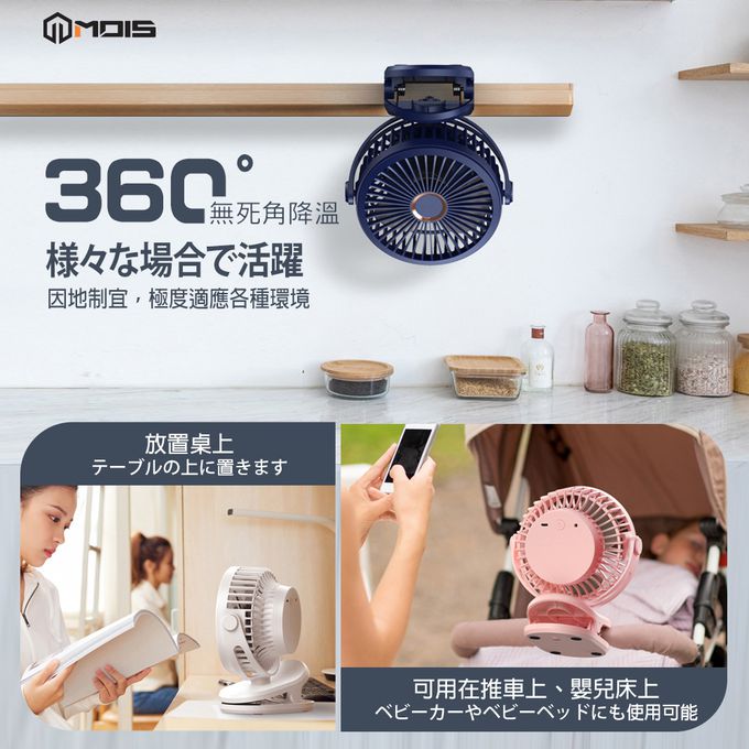 MOIS摩世多功能充電風扇隨時充,隨身帶著走,從頭到腳感受到微秋的沁涼。續電力強,風速不減,環繞式風流,循環不間斷,從此跟悶熱說再見!