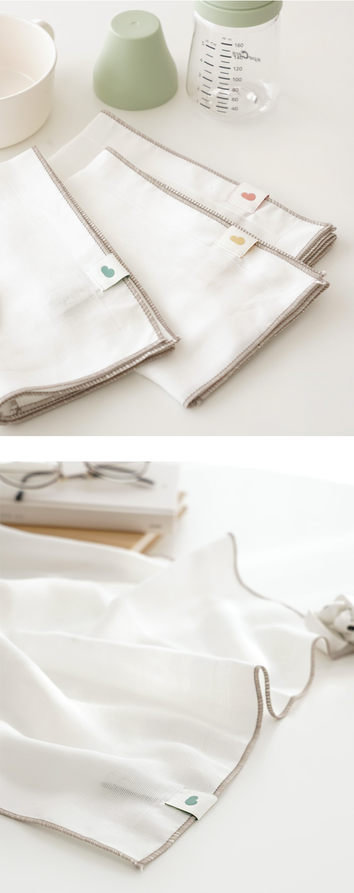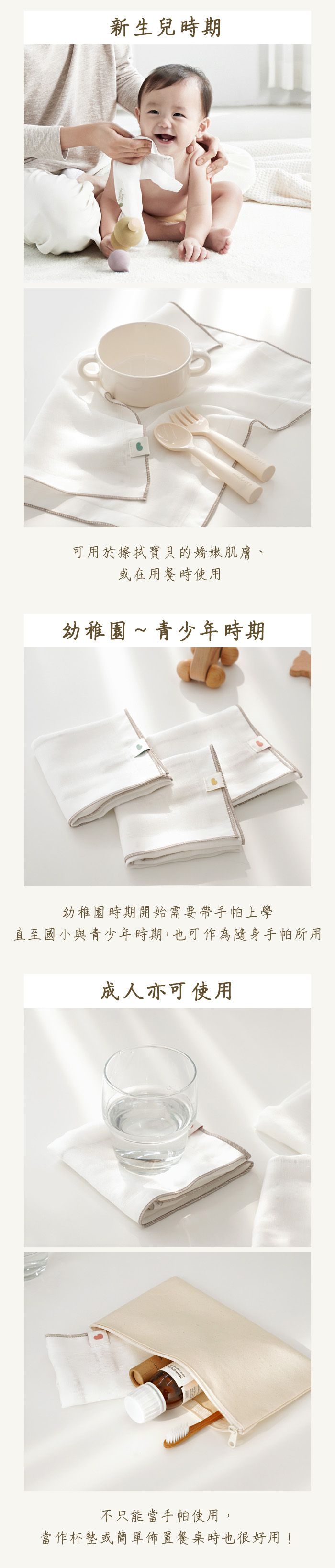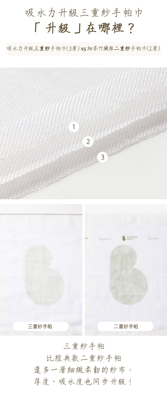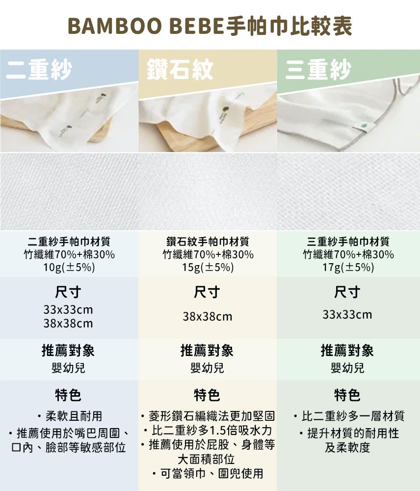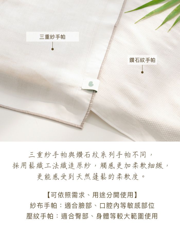適合用於臉部、嘴巴的三重紗手帕巾相較於二重紗手帕巾再多了一層紗布,因此吸水力更加厲害!非常適合常常流口水或汗流不停的寶寶。