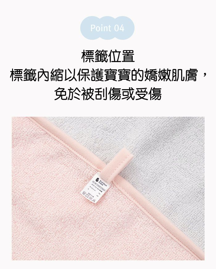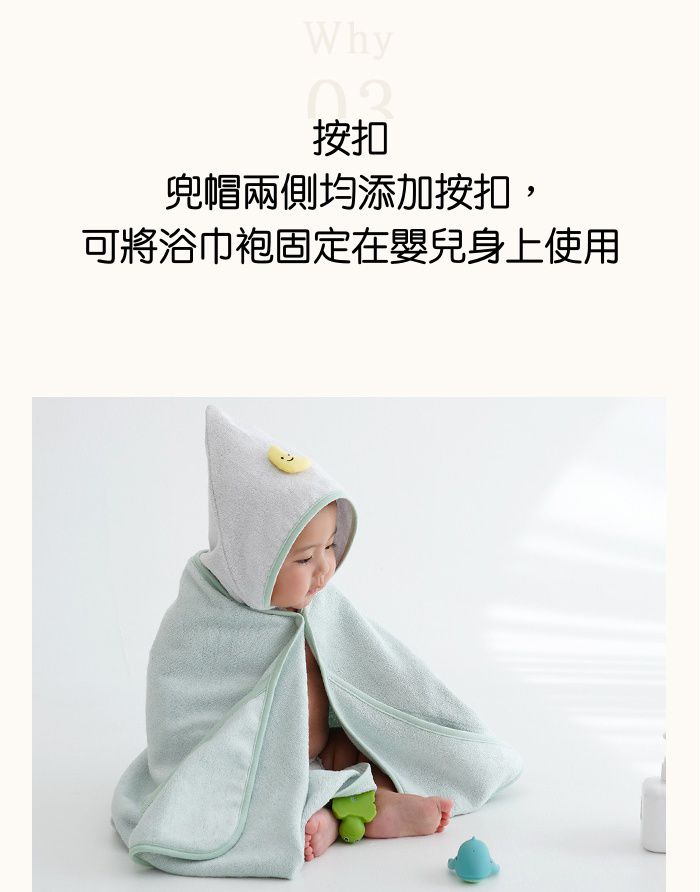 浴巾兩側上也有按扣設計,可以將浴巾袍固定在寶寶身上。
