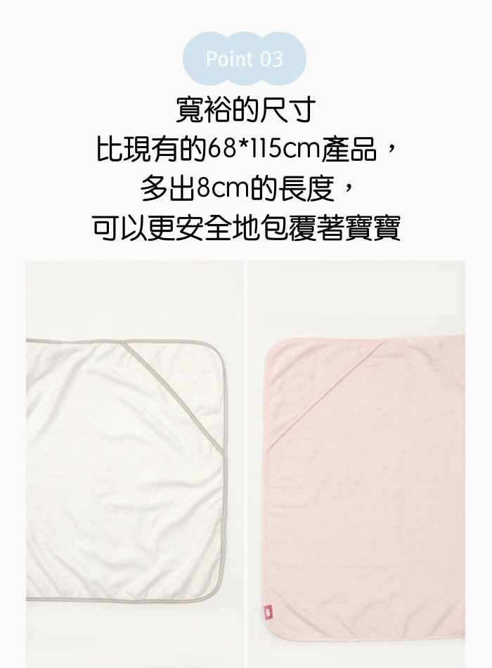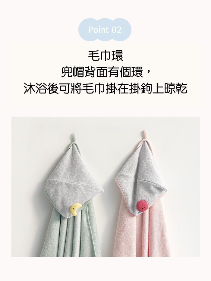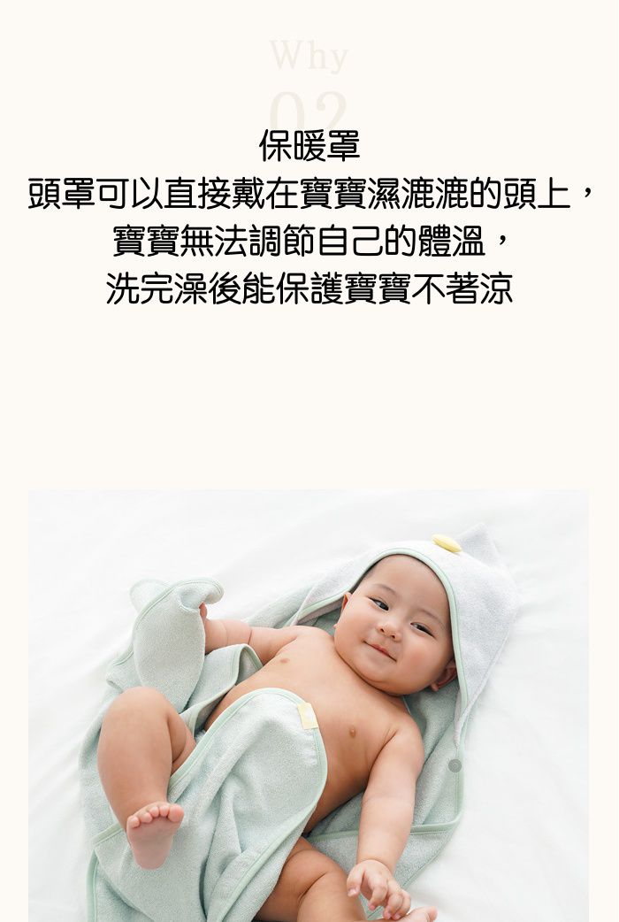 因寶寶無法調節自己的體溫,所以媽咪們常常在幫寶寶洗完澡後都會擔心著涼的問題。這個浴巾的連帽設計可以直接戴在寶寶濕濕的頭上,能保護寶寶不著涼呦!