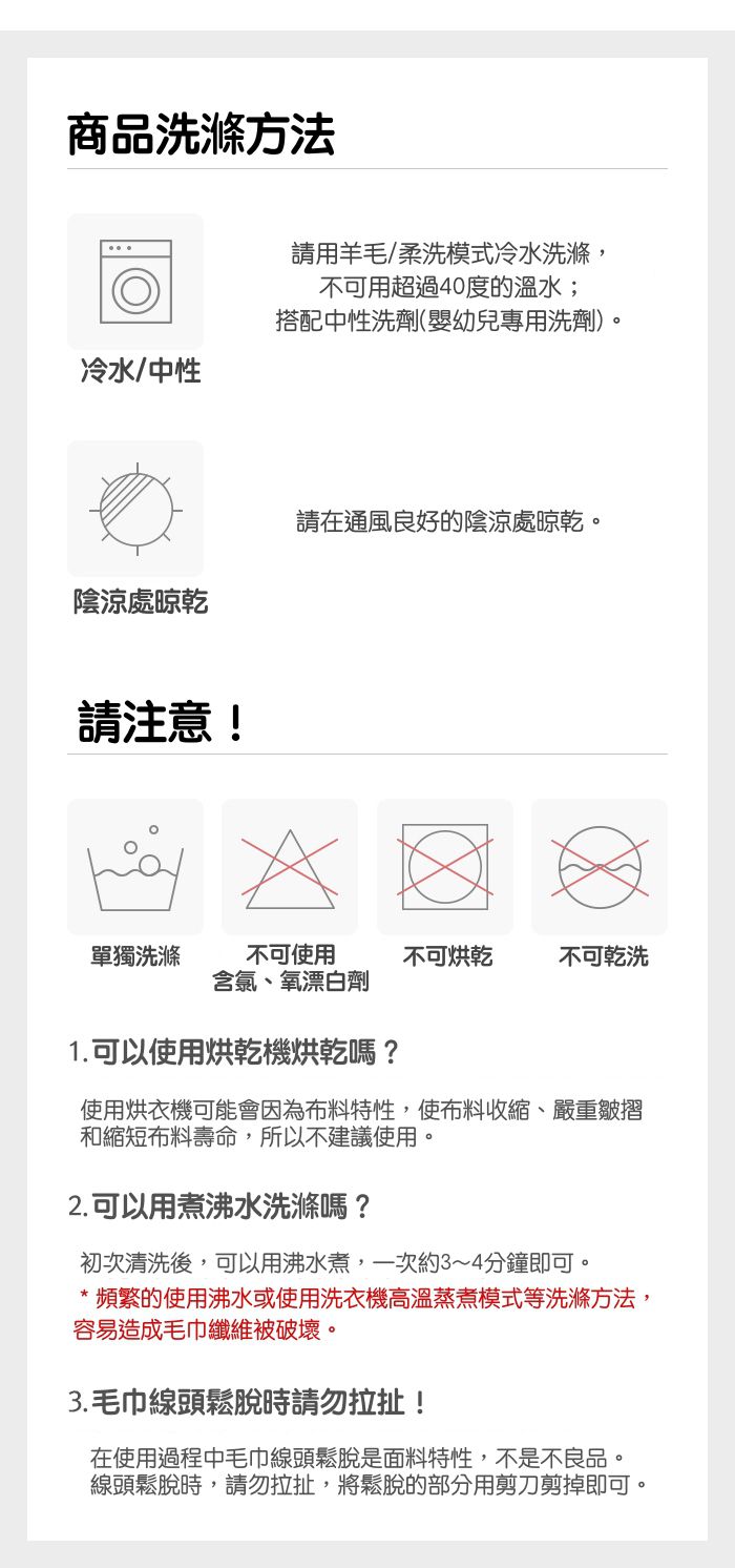 *頻繁使用沸水或洗衣機高溫蒸煮模式等洗滌方式,容易造成紗布巾纖維被破壞呦!