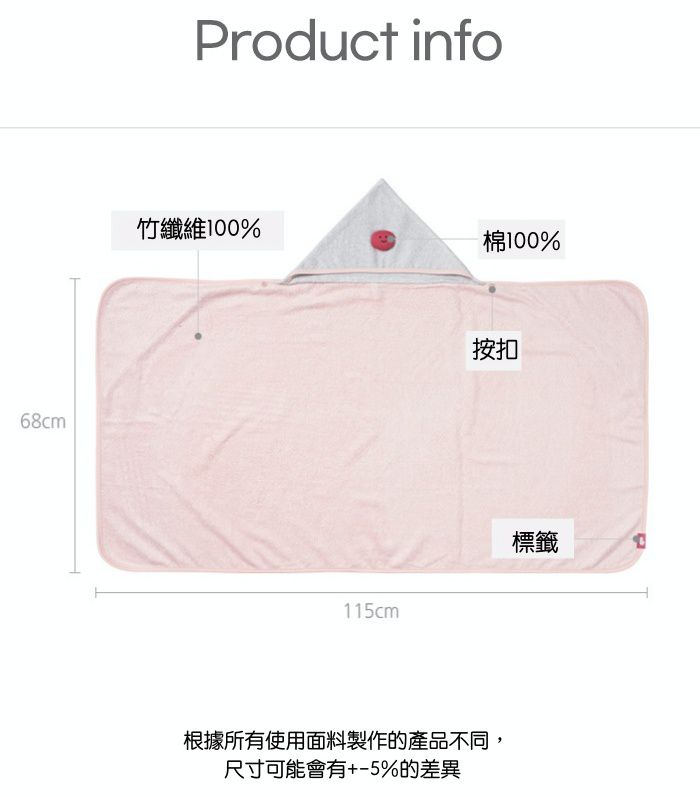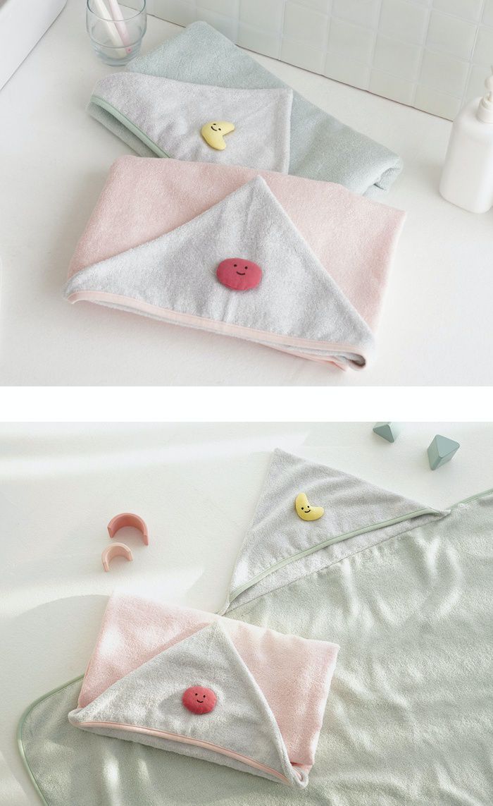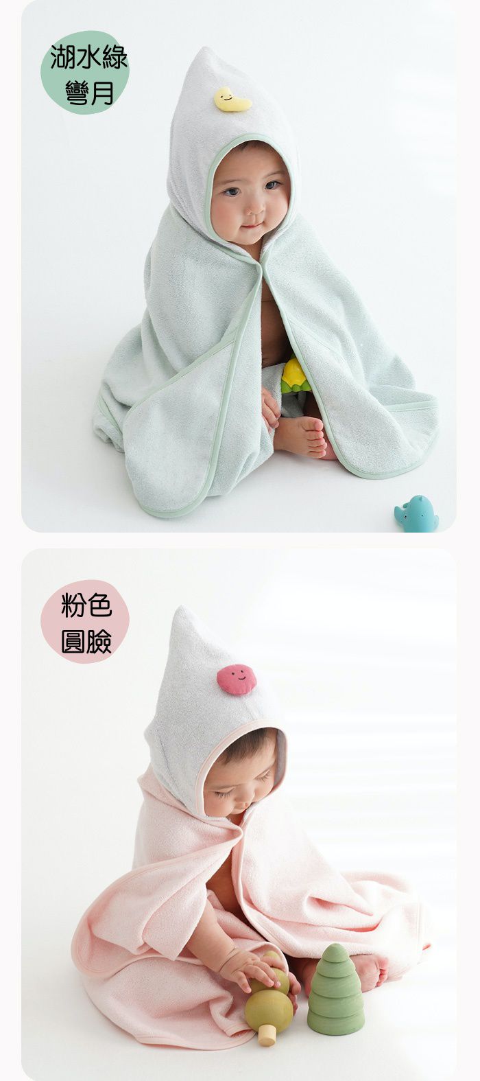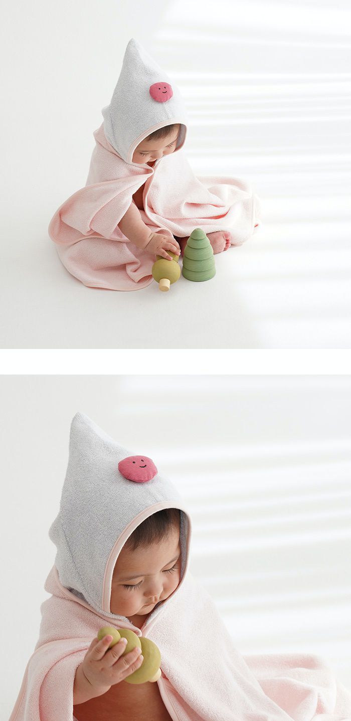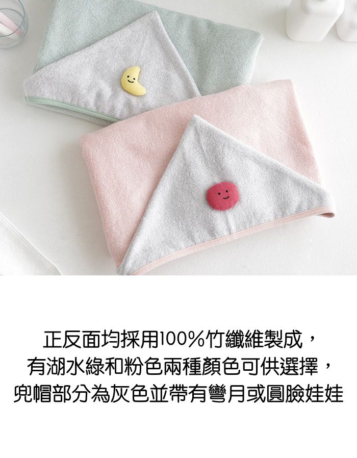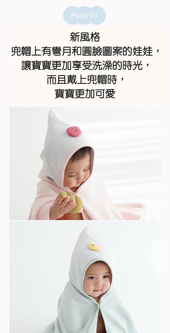 浴巾袍的正反面均採用100%竹纖維製成,有湖水綠和粉色兩種顏色可供選擇,連帽的部分是灰色的並帶有彎月或圓臉娃娃的造型,讓寶寶更加享受洗澡時光~