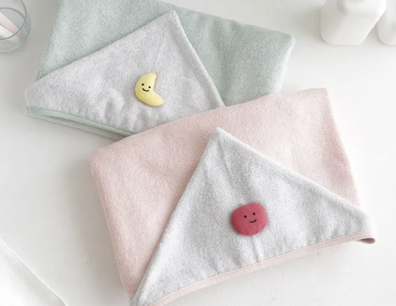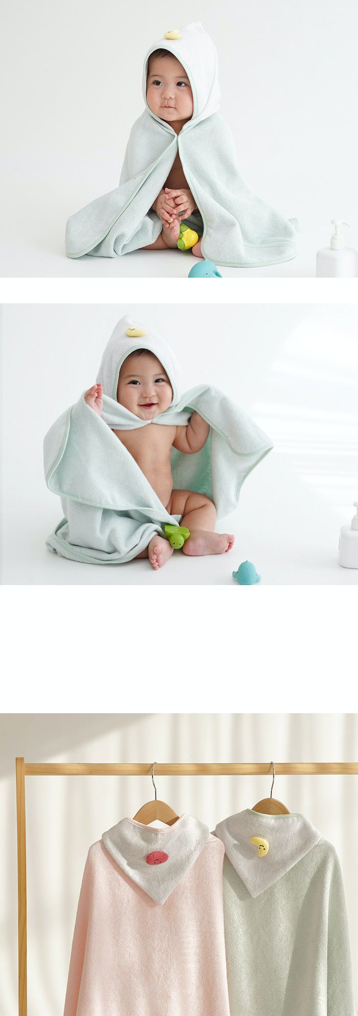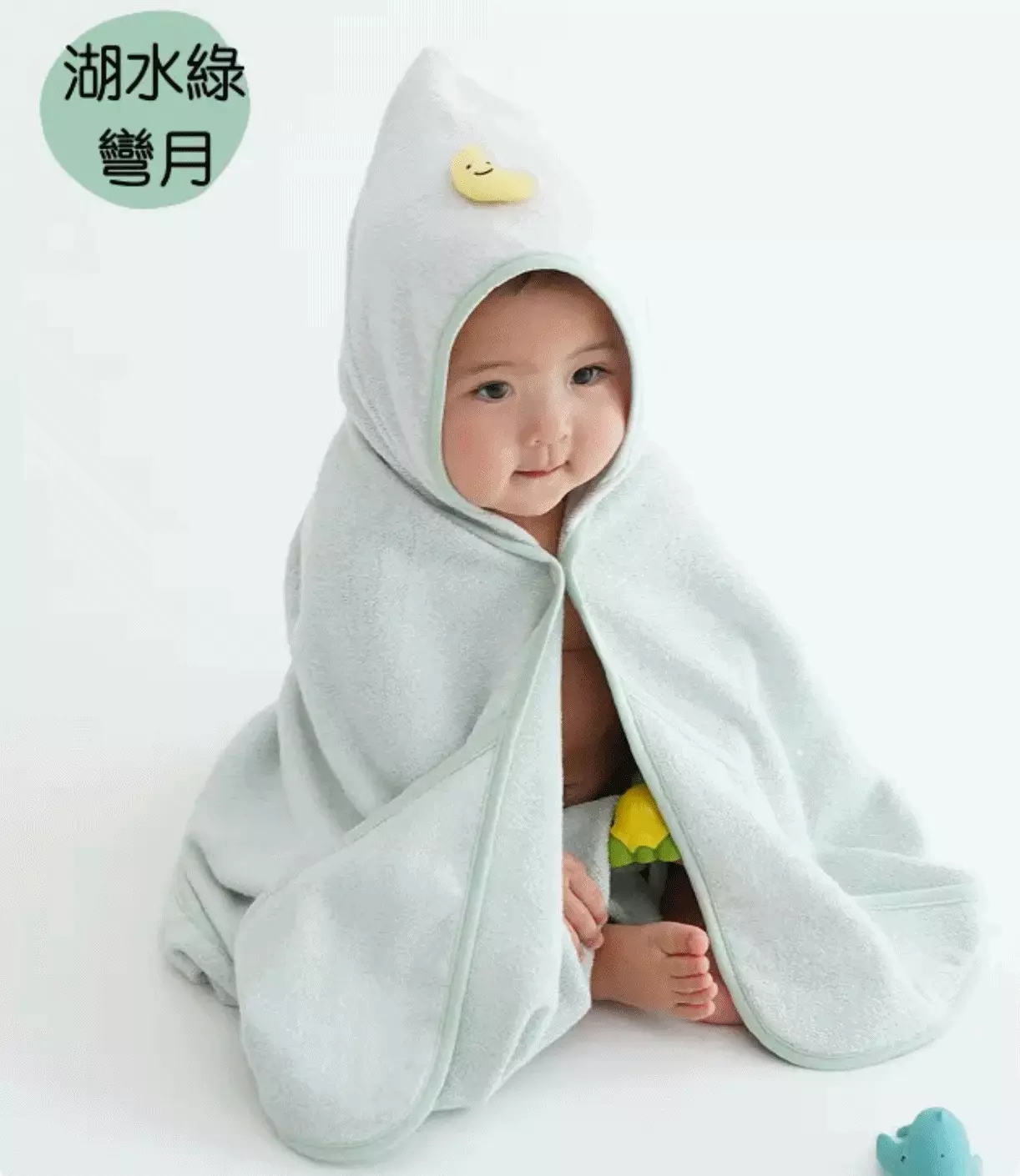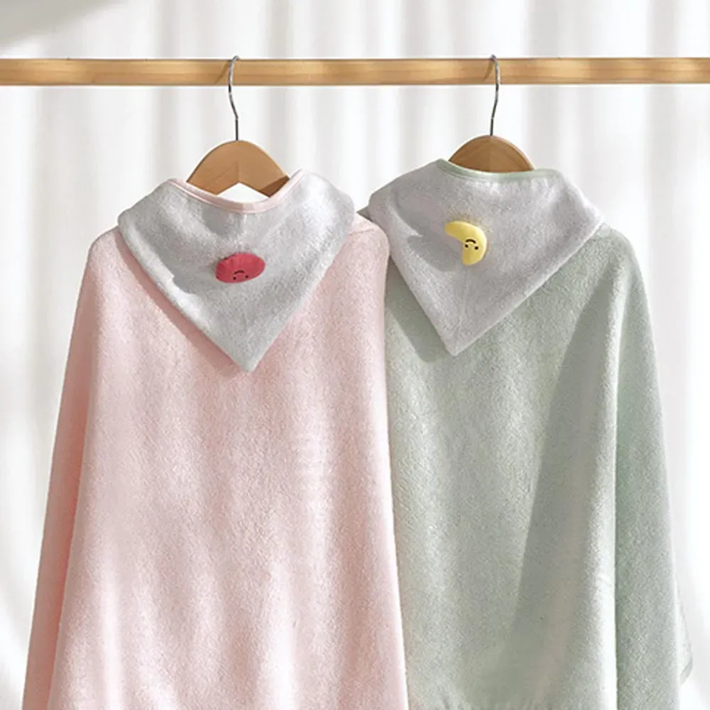 浴巾袍的正反面均採用100%竹纖維製成,有湖水綠和粉色兩種顏色可供選擇,連帽的部分是灰色的並帶有彎月或圓臉娃娃的造型,讓寶寶更加享受洗澡時光~