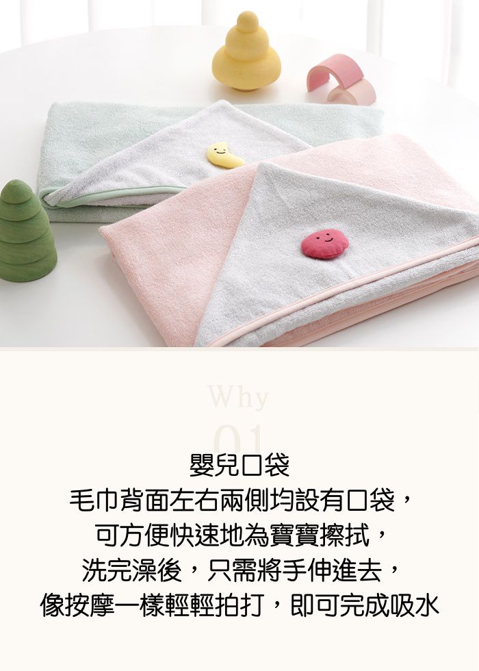 而浴巾背面左右兩側均有口袋設計,可方便快速地為寶寶擦拭!洗完澡後只要將手伸進去,輕輕擦拭即可完成吸水!