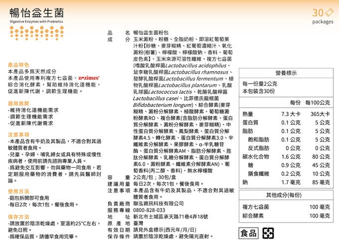 本產品使用整腸複方七益菌、專利原料N-Zimes®綜合消化酵素,幫助維持消化道機能,促進新陳代謝, 調節生理機能。