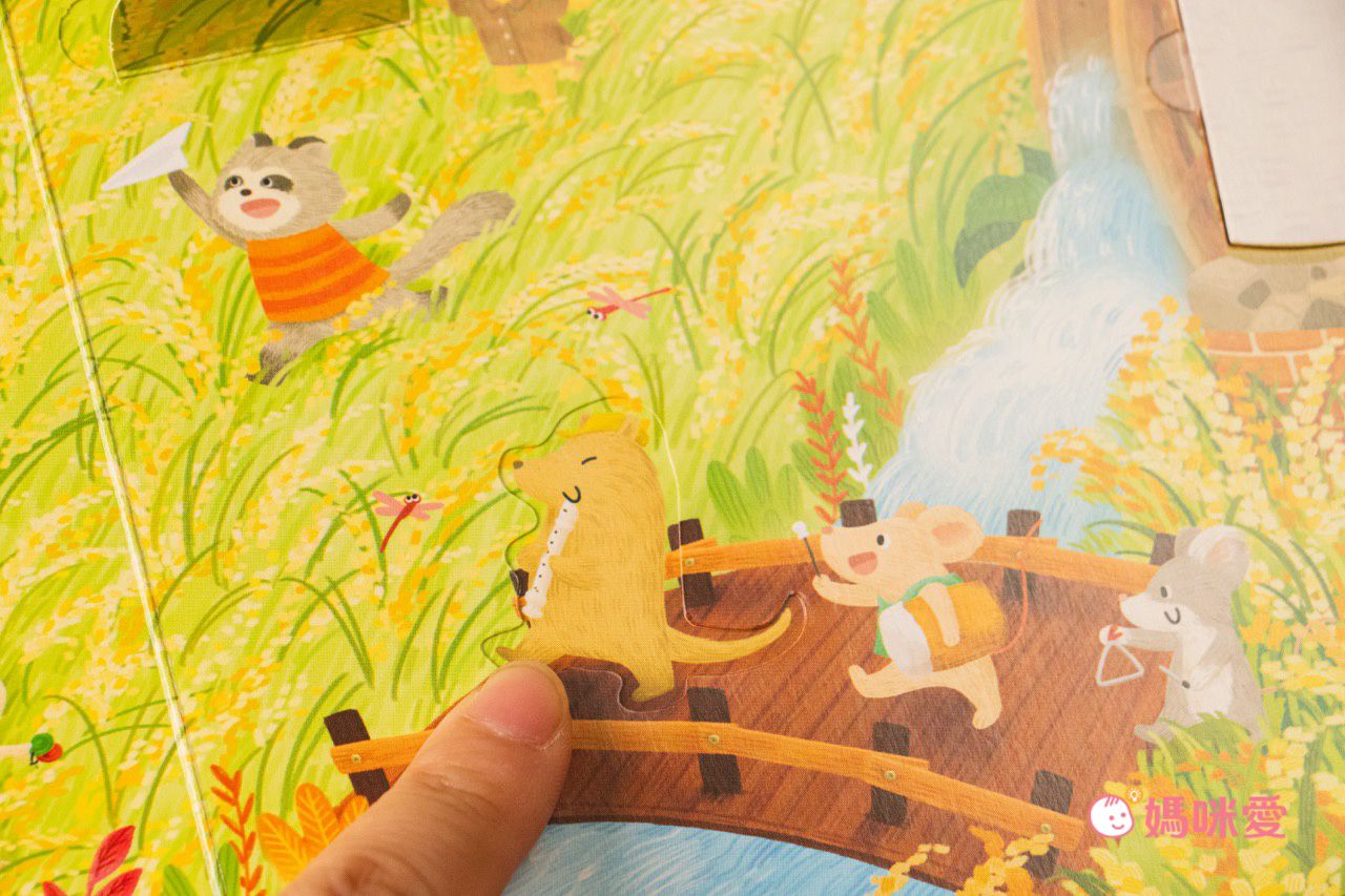 書中時不時還會在異想不到的地方出現翻翻頁!例如屋頂、稻草、籃子等,讓孩子動動手翻一翻,也許會翻到動物們在屋頂玩耍、在稻草後野餐、青蛙偷吃水果等,增加孩子閱讀時的互動性與趣味性~