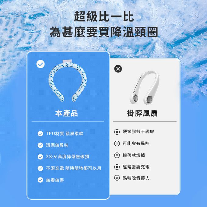 物理降溫,散熱均勻放置28℃以下自動結晶放冰箱後配戴 彷彿隨身攜帶冰風扇快速成冰,持久清涼柔和冰涼,親膚舒適健康材質,安全放心配戴方便,不易脫落