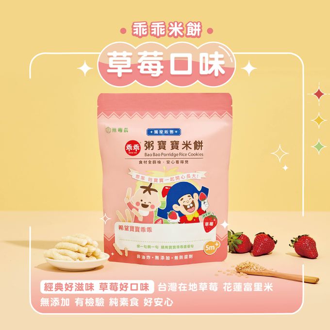 嚴選無毒草莓,推出以「大湖草莓」經典口味的寶寶米餅!