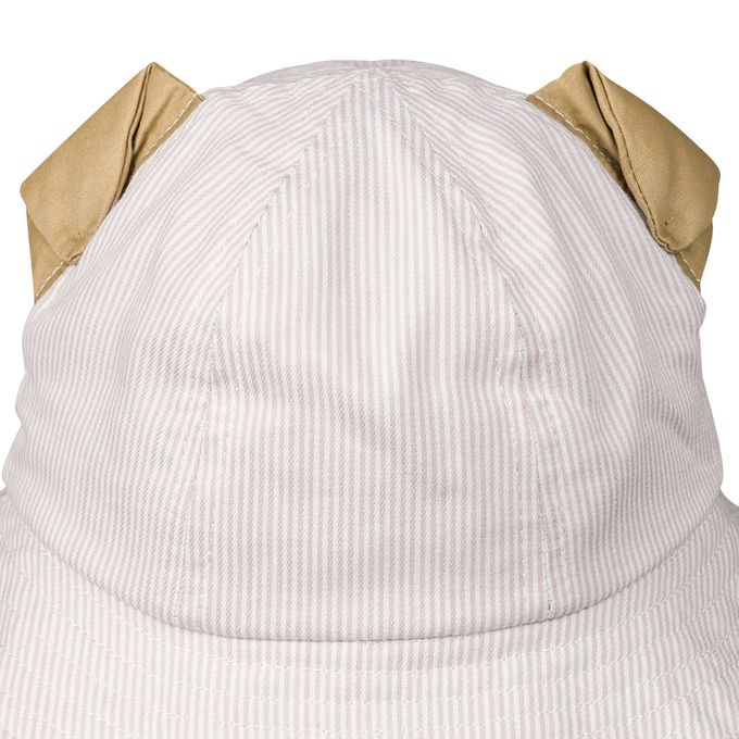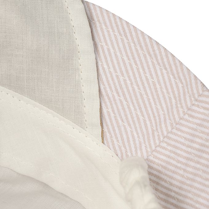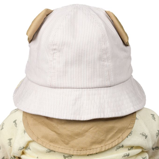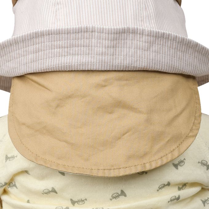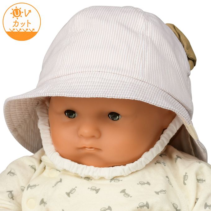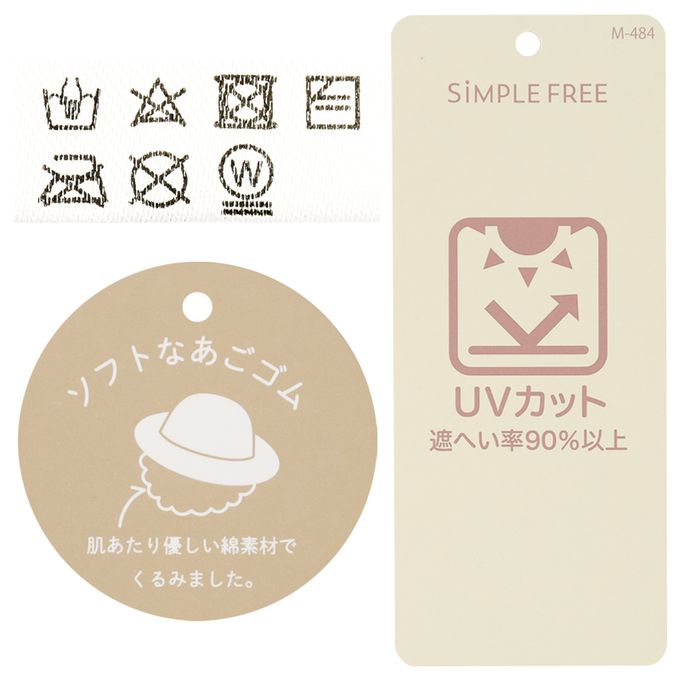 下巴有鬆緊帶可防止被風等吹落。下巴鬆緊帶用布料裹住,使膚觸更舒適。
