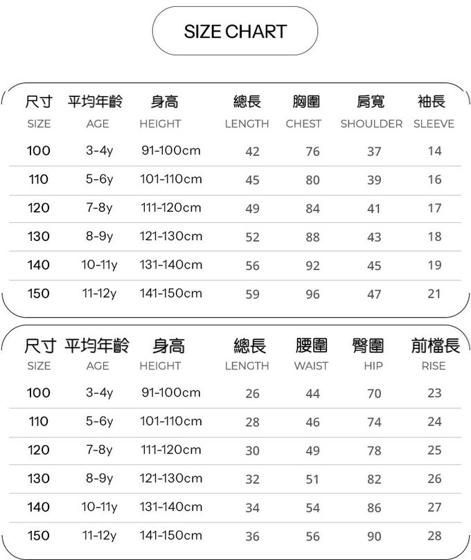 尺寸從90-150公分都有,大小孩和小寶貝都可以穿!