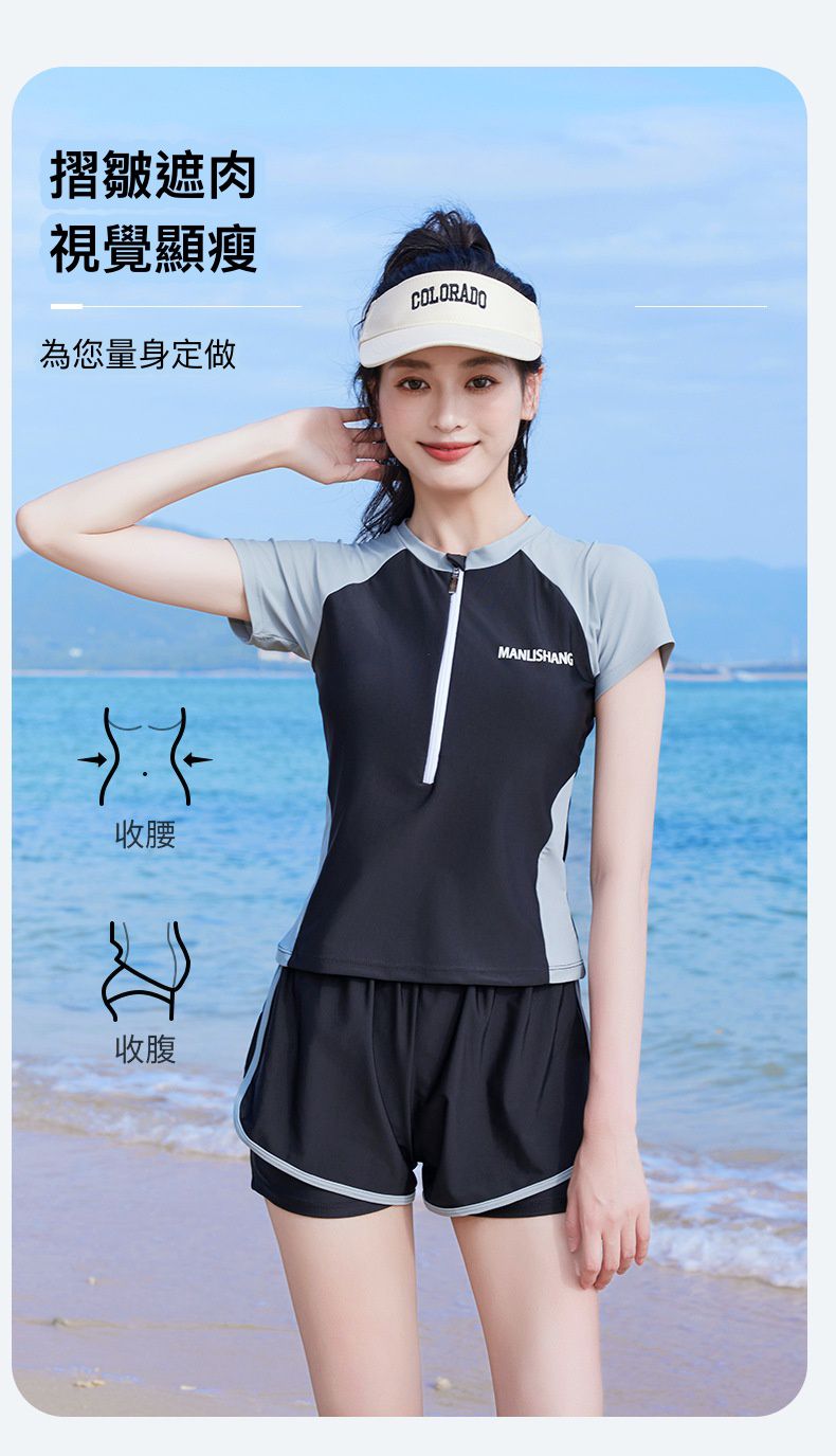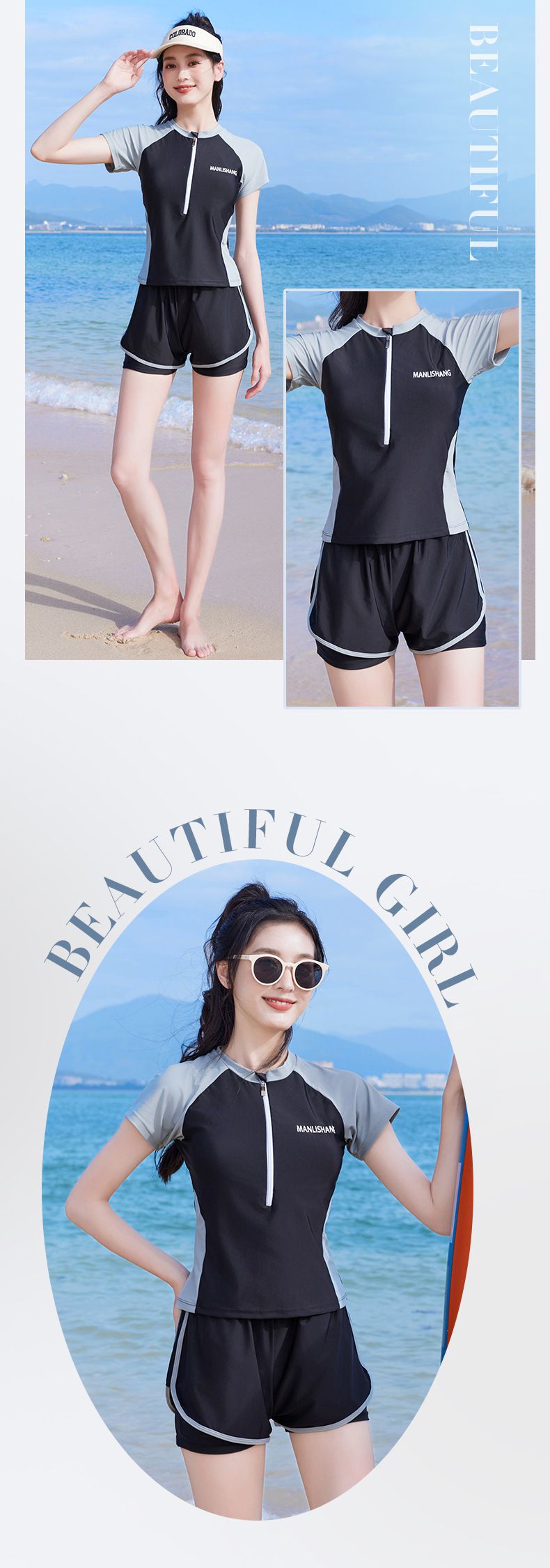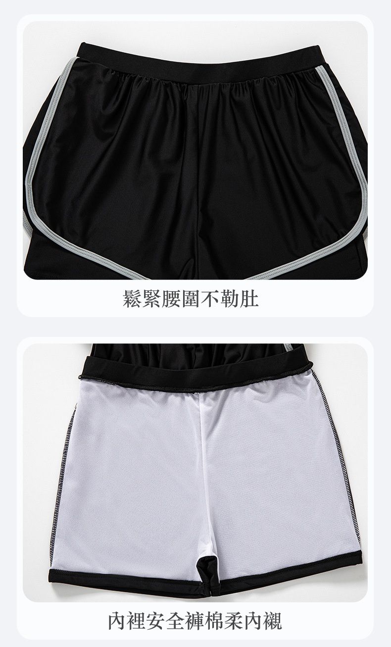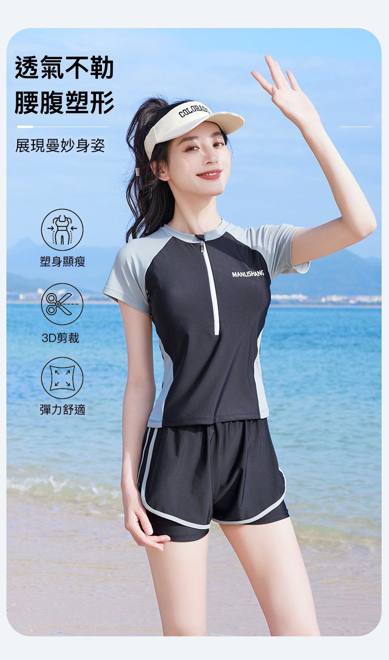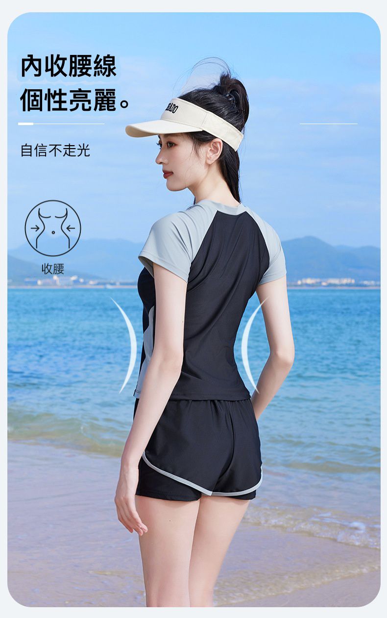 視覺小蠻腰短袖泳衣套裝-拼色黑