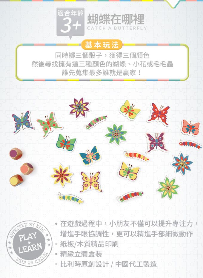 。歐洲經典親子共遊優質遊戲玩具。讓幼兒無接縫進入桌遊遊戲,專注力與思考力的大幅提升。基本遊戲規則:同時擲三個骰子,獲得三個顏色,然後尋找擁有這三種顏色的蝴蝶、小花或毛毛蟲,誰先蒐集最多誰就是贏家!。在遊戲過程中,小朋友不僅可以提升專注力,增進手眼協調性,更可以精進手部細微動作。紙板/木質精品印刷。適合年齡:3歲。精緻立體盒裝。比利時原創設計 / 中國代工製造