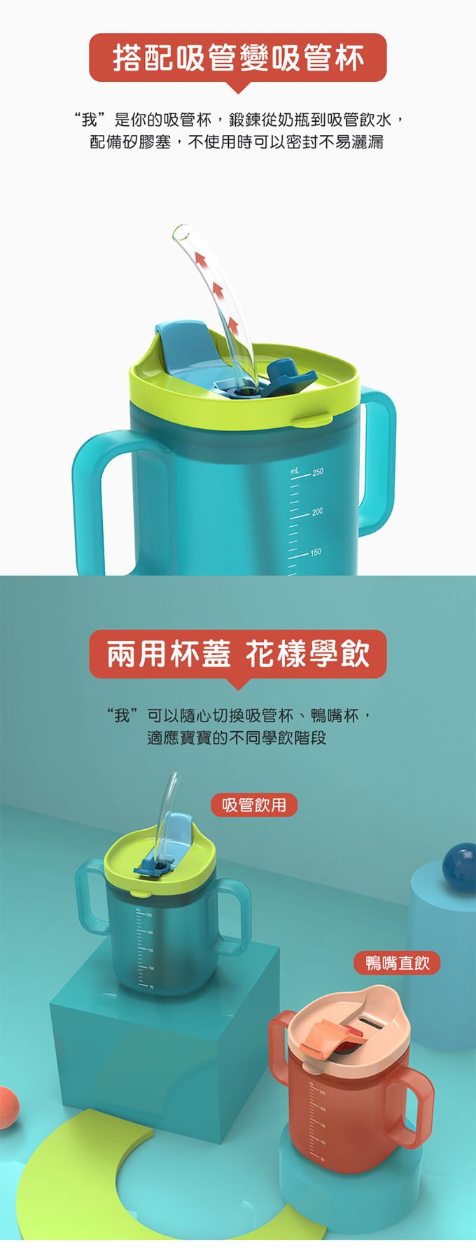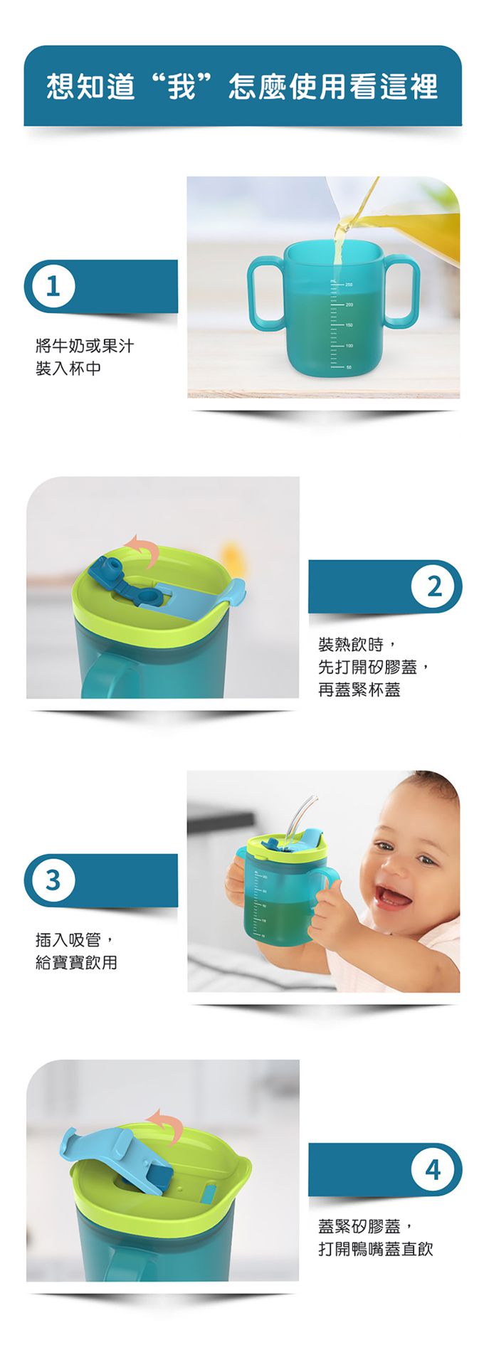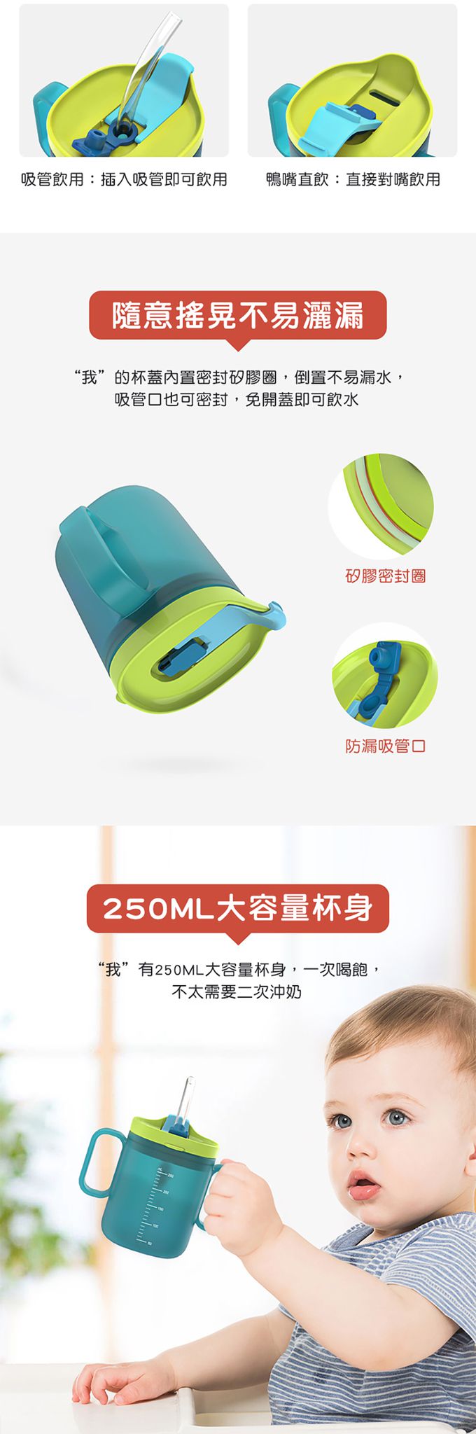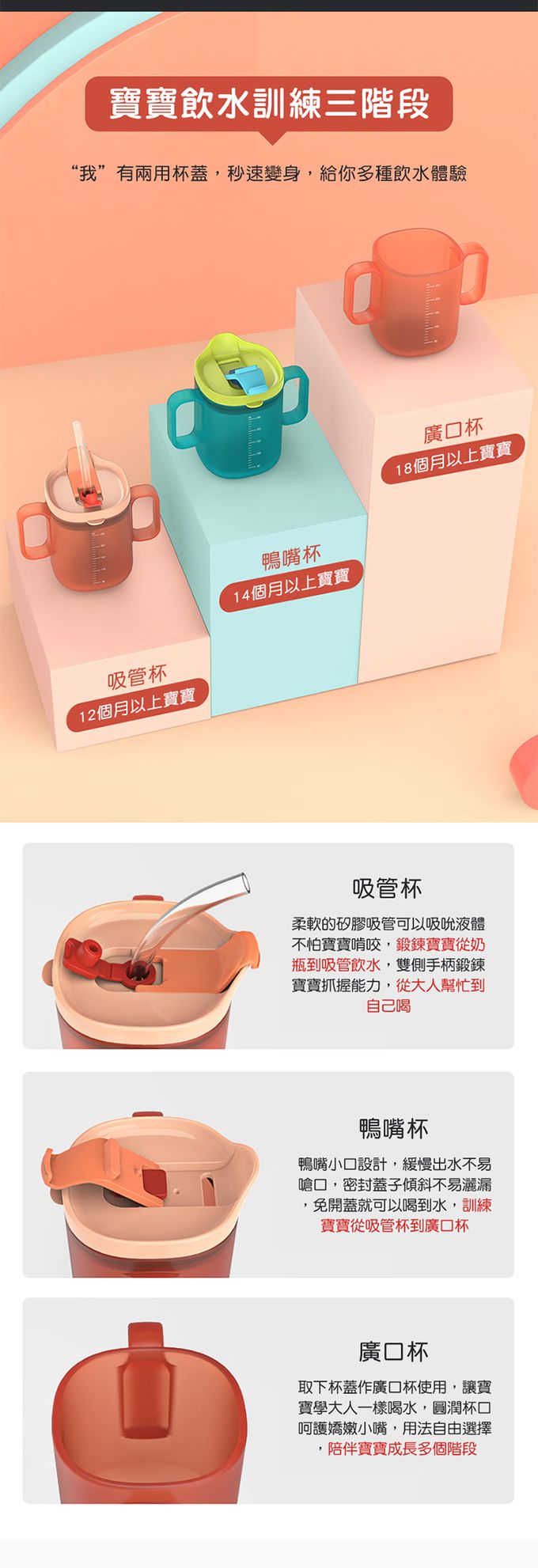 1.三種不同飲用方式,適合不同時期的寶寶做喝水練習。
