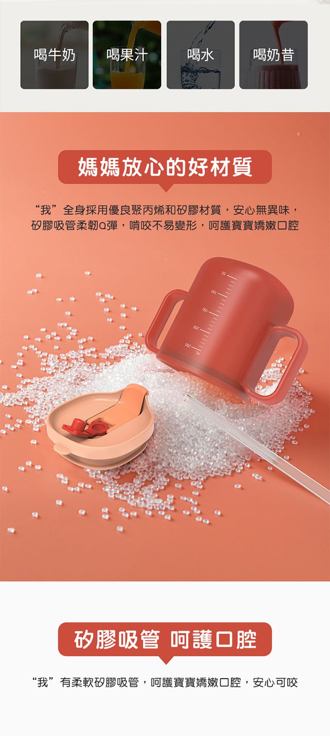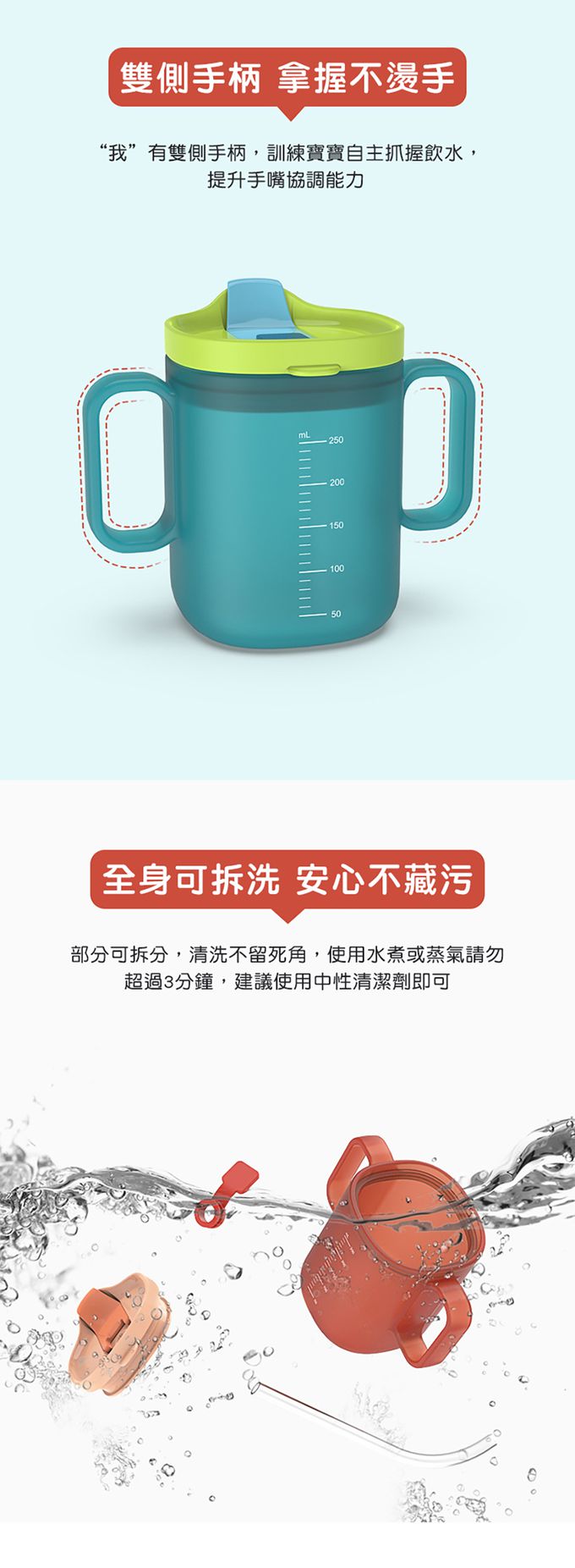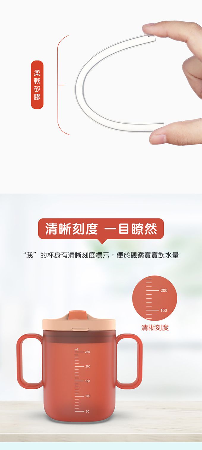 3.兩側都有手柄,同時訓練小手手好好地拿住杯子。