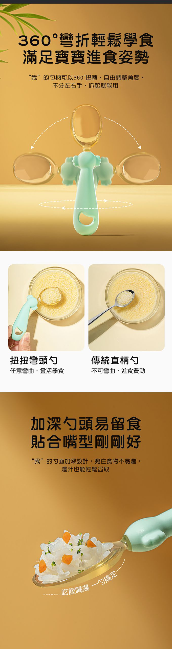 1.可彎曲握把,左右手都容易使用,也更容易訓練吃飯飯角度