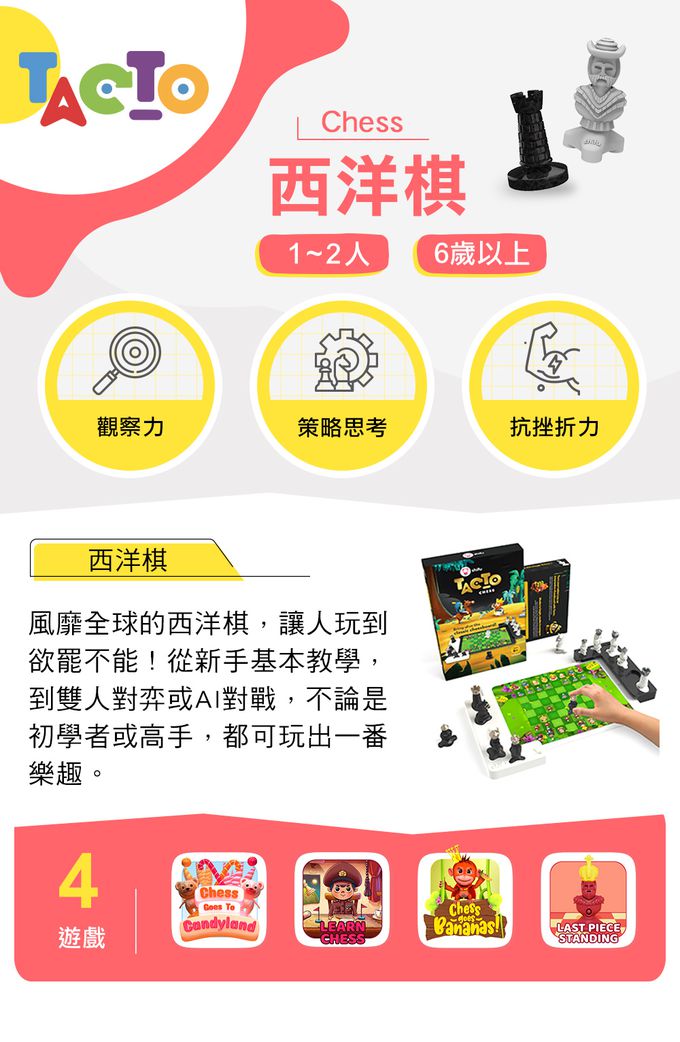 西洋棋是風靡全球大人小孩的益智遊戲,TACTO內建西洋棋教學和對弈模式,不論新手、高手都能享受下棋的樂趣!