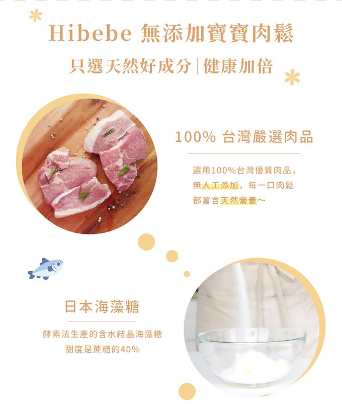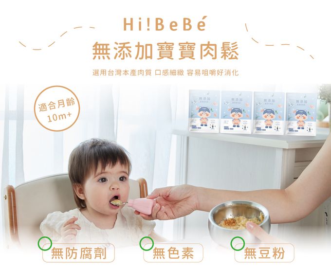 HIBEBE 無添加寶寶肉鬆系列▪細緻口感 營養好消化▪ 奶奶的愛 x 營養師配方▪ 使用台灣嚴選肉品,無任何人工添加▪ 寶寶肉鬆只選天然新鮮食材 增加寶寶食慾及補充營養▪ Hibebe 與 Bebefood寶寶福德聯名,給孩子吃到最好且無負擔▪ 寶寶肉鬆3秒簡單料理快速上桌,讓孩子大口吃飯飯