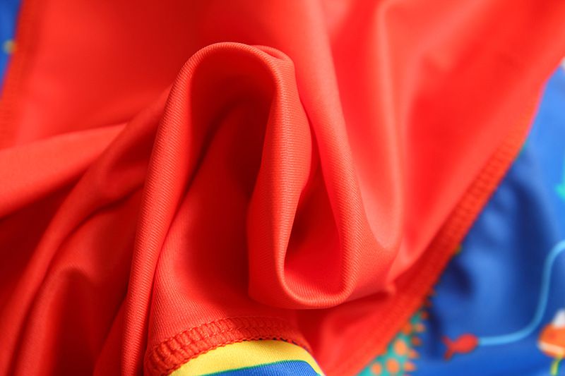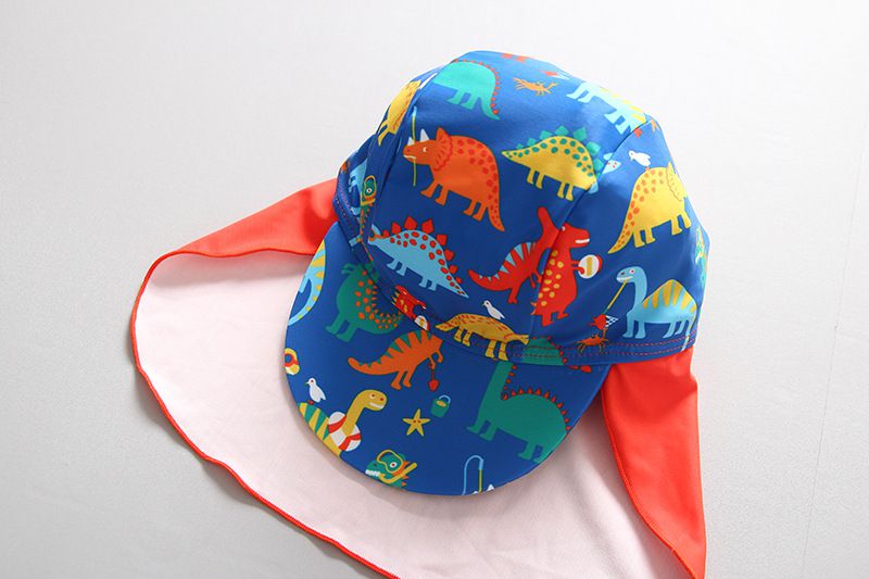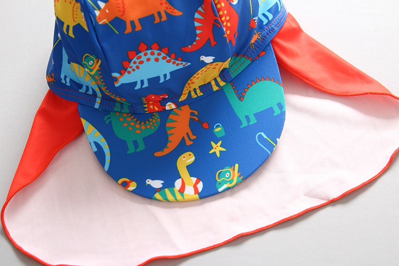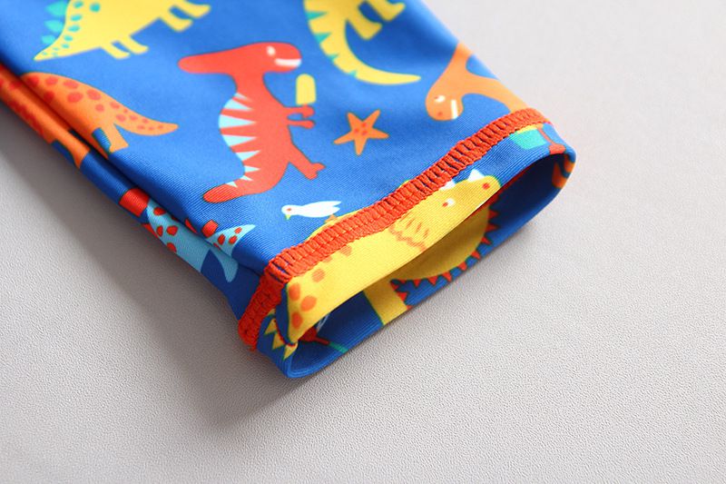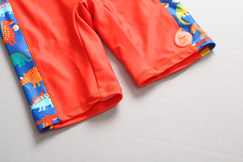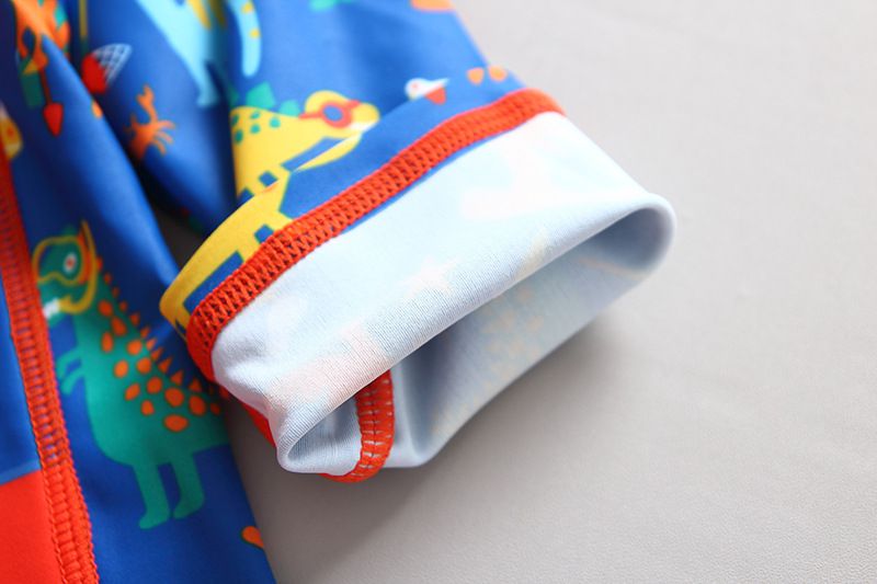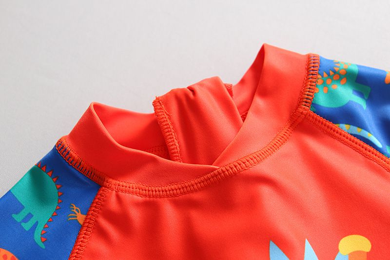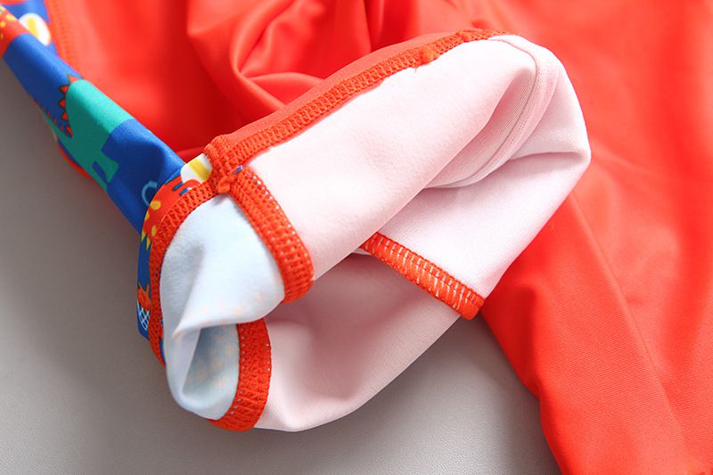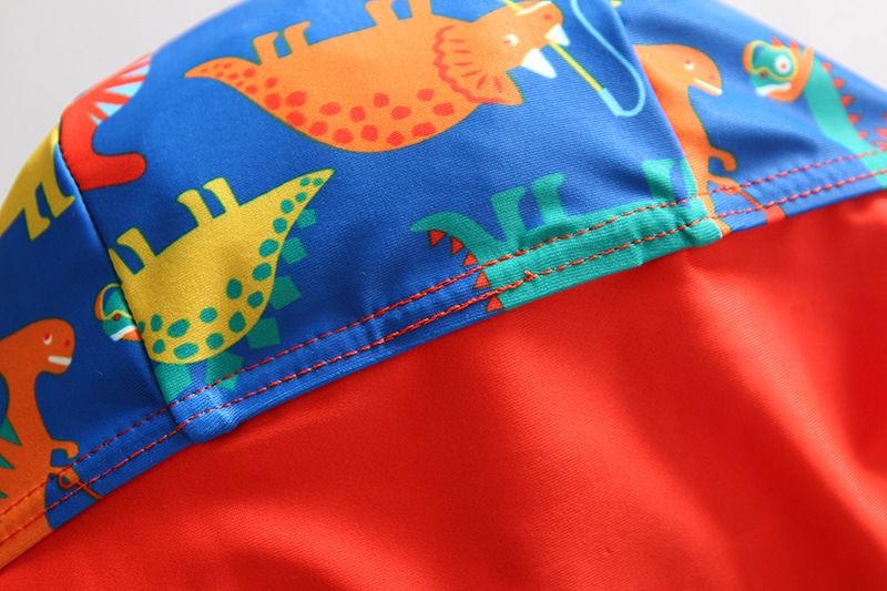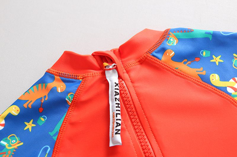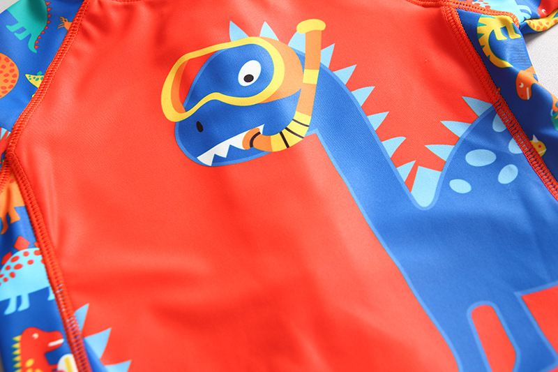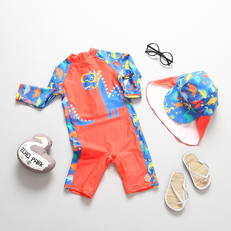 男寶防曬長袖連身泳裝(附帽子)-潛水恐龍-橘紅+藍