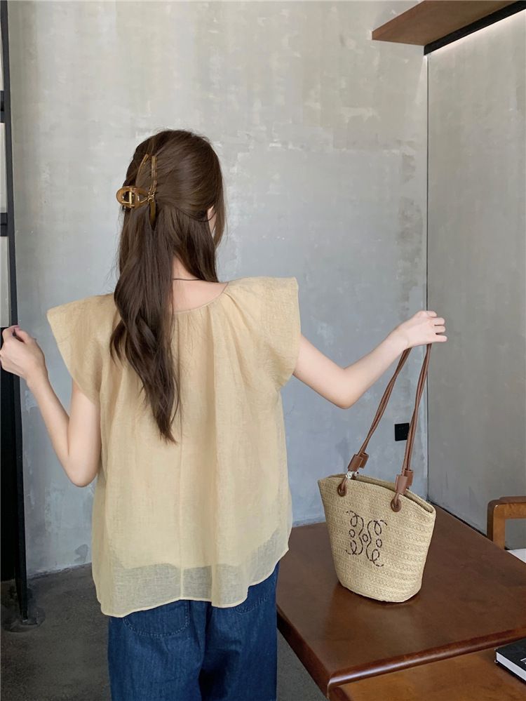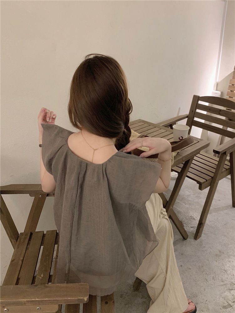824273 小清新花卉刺繡短袖上衣(一字領/方領)-淡藍色 (F)