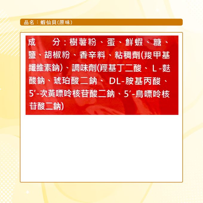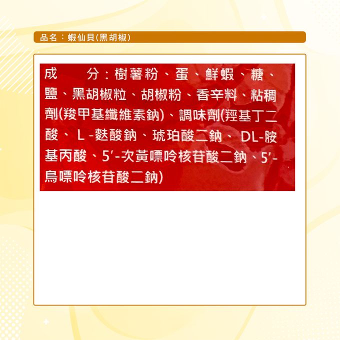 成分:原味:樹薯粉、蛋、鮮蝦、糖、鹽、胡椒粉、香辛料、粘稠劑(羧甲基纖維素鈉)、調味劑(羥基丁二酸、L-麩酸鈉、琥珀酸二鈉、DL-胺基丙酸、5'–次黃嘌呤核苷酸二鈉、5'-鳥嘌呤核苷酸二鈉) 海苔:樹薯粉、蛋、鮮蝦、糖、鹽、海苔粉、胡椒粉、香辛料、粘稠劑(羧甲基纖維素鈉)、調味劑(羥基丁二酸、L-麩酸鈉、琥珀酸二鈉、DL-胺基丙酸、5'–次黃嘌呤核苷酸二鈉、5'-鳥嘌呤核苷酸二鈉) 黑胡椒:樹薯粉、蛋、鮮蝦、糖、鹽、黑胡椒粒、胡椒粉、香辛料、粘稠劑(羧甲基纖維素鈉)、調味劑(羥基丁二酸、L-麩酸鈉、琥珀酸二鈉、DL-胺基丙酸、5'–次黃嘌呤核苷酸二鈉、5'-鳥嘌呤核苷酸二鈉) 三星蔥:樹薯粉、蛋、青蔥、鮮蝦、糖、鹽、胡椒粉、香辛料、粘稠劑(羧甲基纖維素鈉)、調味劑(羥基丁二酸、L-麩酸鈉、琥珀酸二鈉、DL-胺基丙酸、5'–次黃嘌呤核苷酸二鈉、5'-鳥嘌呤核苷酸二鈉)