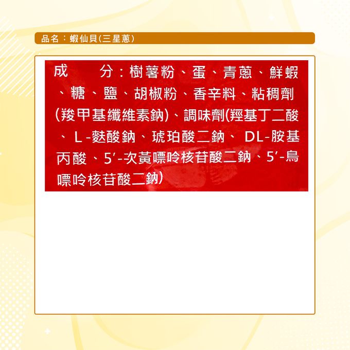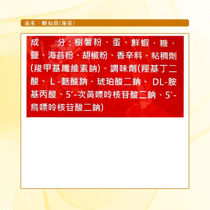 過敏原:本產品含有蝦,對此過敏或特殊體質者,請避免食用