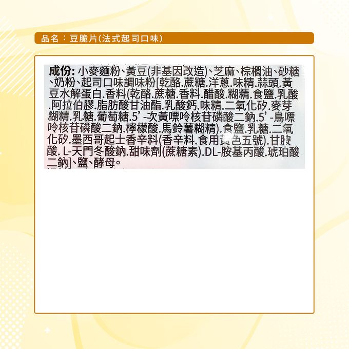 成分:起司:小麥麵粉、黃豆(非基因改造)、芝麻、棕櫚油、砂糖、奶粉、起司口味調味粉[乾酪、蔗糖、洋蔥、味精、蒜頭、黃豆水解蛋白、香料(乾酪、蔗糖、香料、醋酸.糊精、食鹽、乳酸、阿拉伯膠、脂肪酸甘油脂、乳酸鈣、味精、二氧化矽、麥芽糊精、乳糖、葡萄糖.5’-次黃嘌呤核苷磷酸二鈉.5’-鳥嘌呤核苷磷酸二鈉.檸檬酸.馬鈴薯糊精)、食鹽、乳糖、二氧化矽、墨西哥起士香辛料(香辛料、食用黃色五號)、甘胺酸.L-天門冬酸鈉、甜味劑(蔗糖素)、DL-胺基丙酸.琥珀酸二鈉]、鹽、酵母 泡菜:小麥麵粉、黃豆(非基因改造)、芝麻、棕櫚油、砂糖、奶粉、泡菜風味調味粉(糖、洋蔥、辣椒、胡椒、調味劑(味精.5’-鳥嘌呤核苷磷酸二鈉.5’-次黃嘌呤核苷磷酸二鈉).醬油粉(醬油.麥芽糊精)、鹽、麥芽糊精、番茄粉、醋酸鈉、檸檬酸、食用黃色五號、二氧化矽、香料、甜味劑(阿斯巴甜))、鹽、酵母 醬燒:小麥麵粉、黃豆(非基因改造)、芝麻、棕櫚油、砂糖、麥芽糖、醬油、奶粉、鹽、酵母