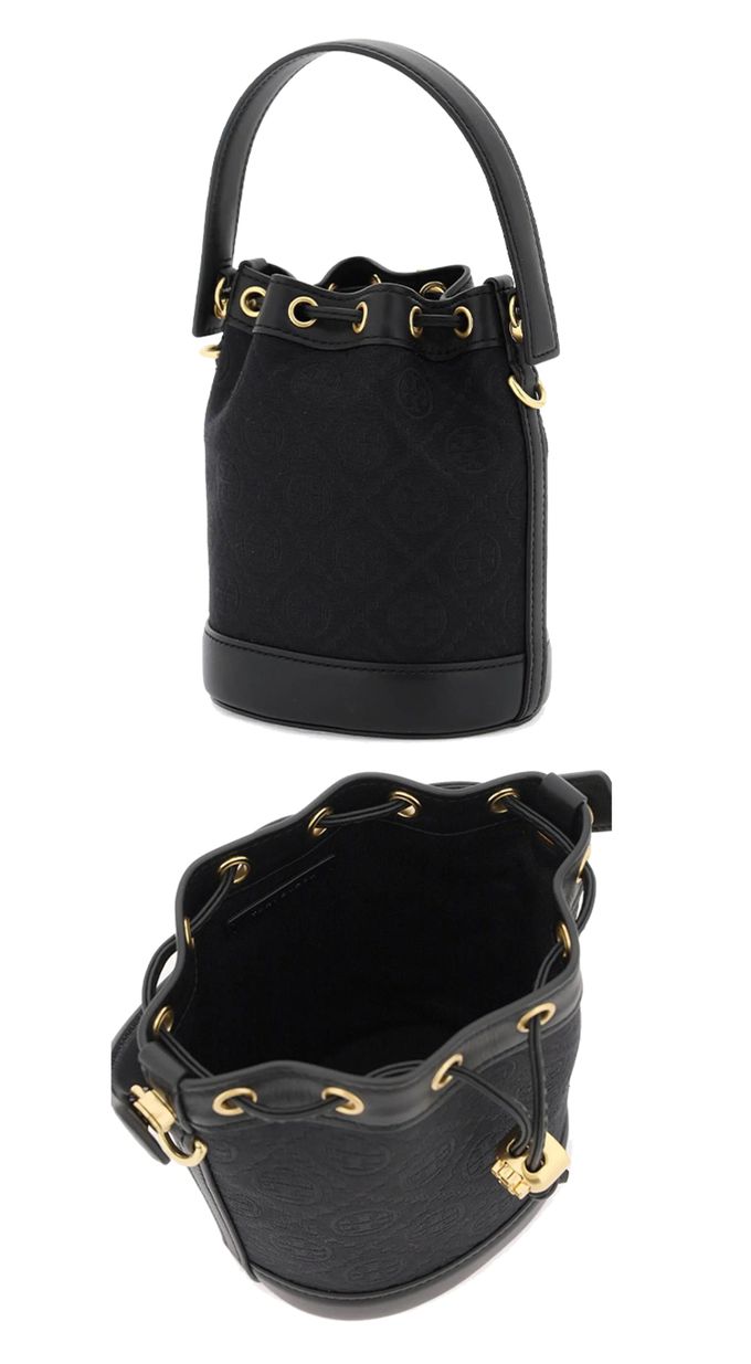 織布拼接皮革水桶包 (黑)