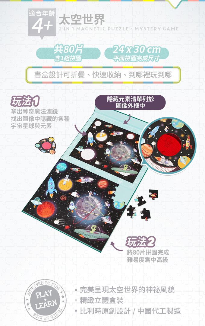 。歐洲質感磁性益智拼圖系列。書盒設計可折疊、快速收納、到哪裡玩到哪。完美呈現太空世界的神祕風貌。上半部為濾鏡遊戲, 下半部為拼圖遊戲。共有兩種玩法:。遊戲1(上半部):拿出神奇魔法濾鏡,找出圖像中隱藏的各種宇宙星球與元素 (隱藏元素清單列於圖像外框中)。遊戲2 (下半部):將80片拼圖完成,難易度為中高。適合年齡:4歲。比利時原創設計 / 中國代工製造