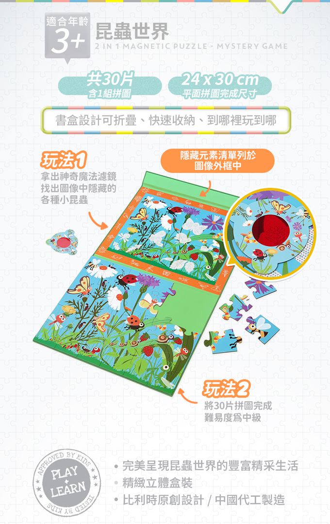 。歐洲質感磁性益智拼圖系列。書盒設計可折疊、快速收納、到哪裡玩到哪。完美呈現昆蟲世界的豐富精采生活。共有兩種玩法:。遊戲1(上半部):拿出神奇魔法濾鏡,找出圖像中隱藏的各種小昆蟲 (隱藏元素清單列於圖像外框中)。遊戲2 (下半部):將30片拼圖完成,難易度適中。適合年齡:3歲。比利時原創設計 / 中國代工製造